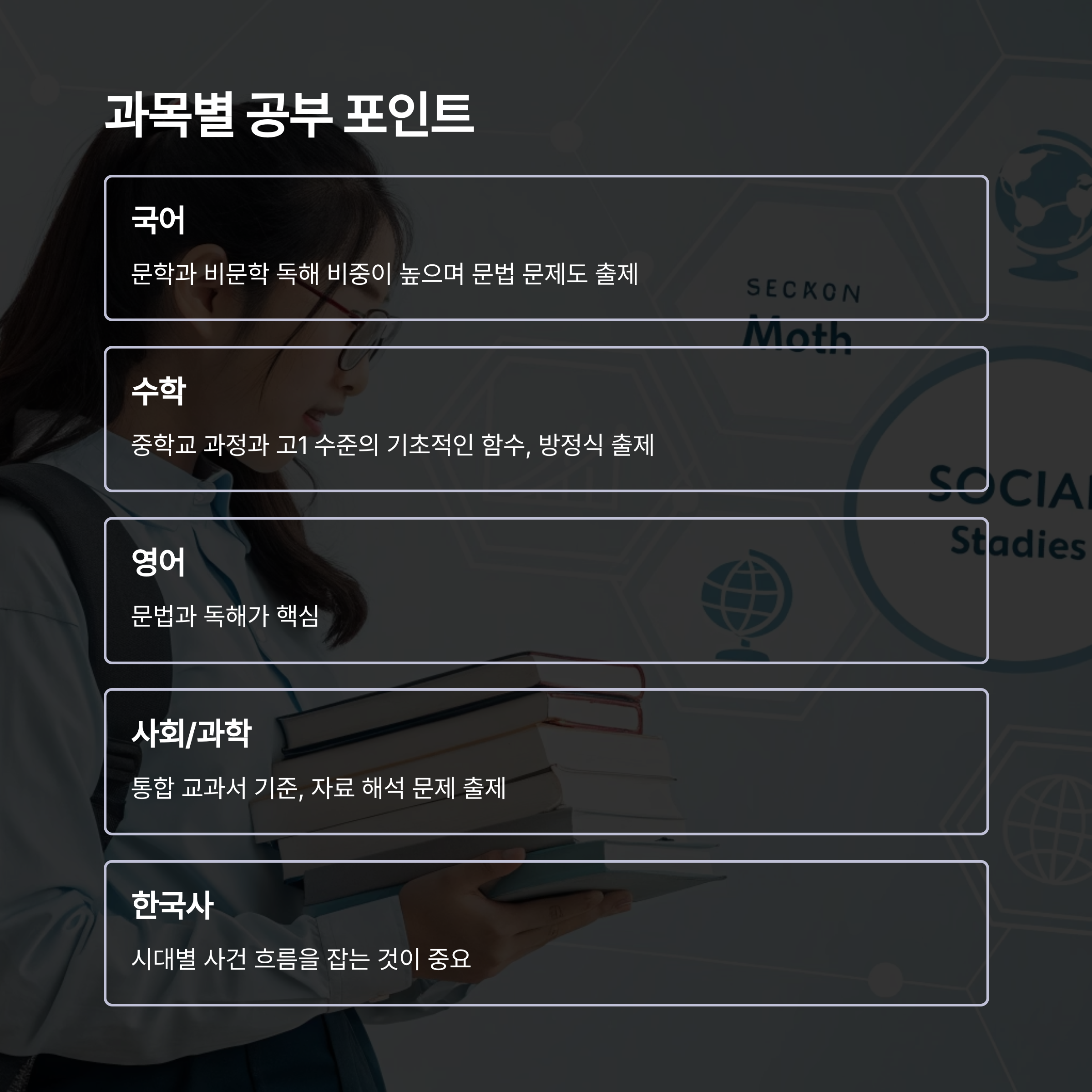 - 필수 과목 6개: 국어, 수학, 영어, 사회, 과학, 한국사
