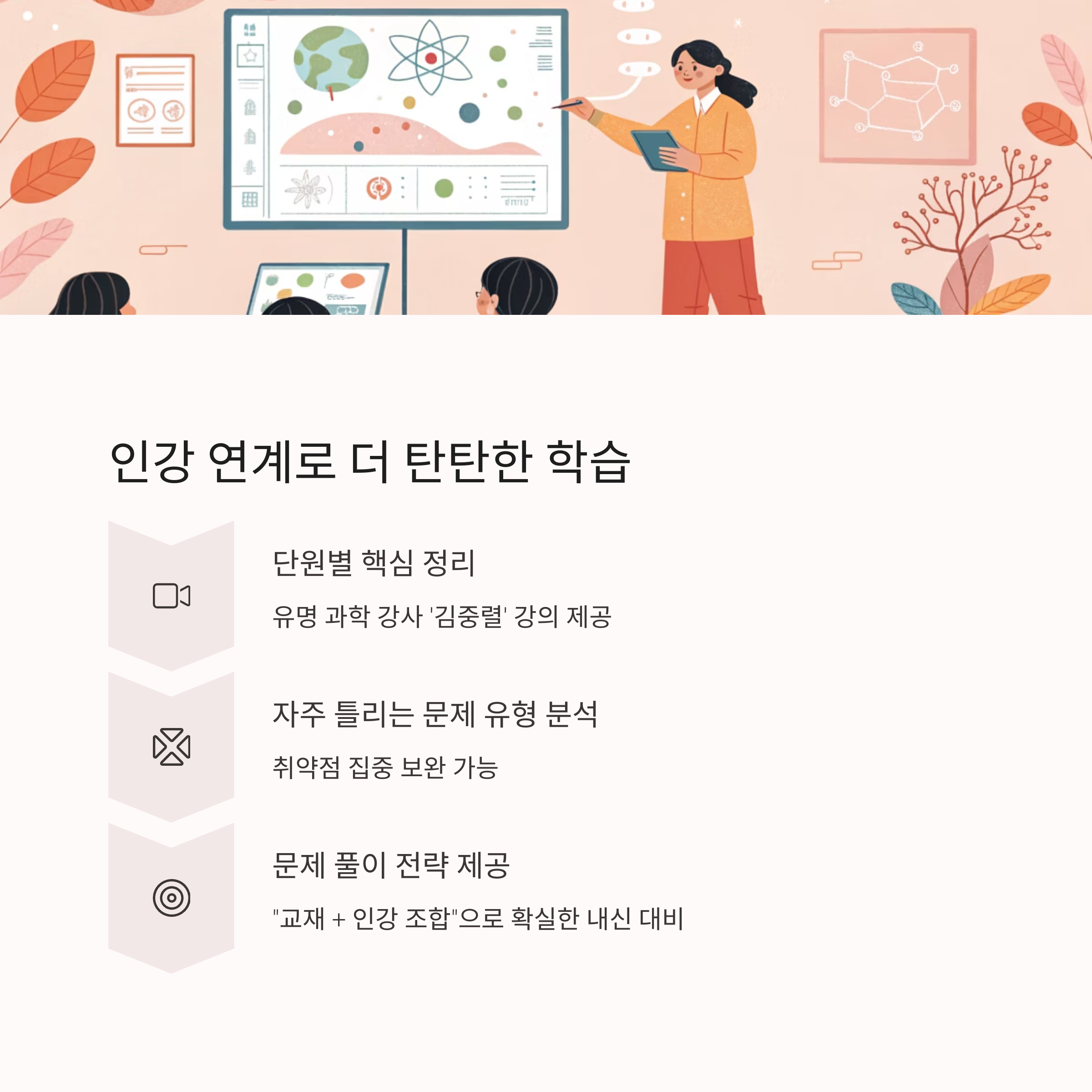 과학에 자신 없는 학생도 기초부터 차근차근 실력을 쌓을 수 있도록 돕는 구조입니다.