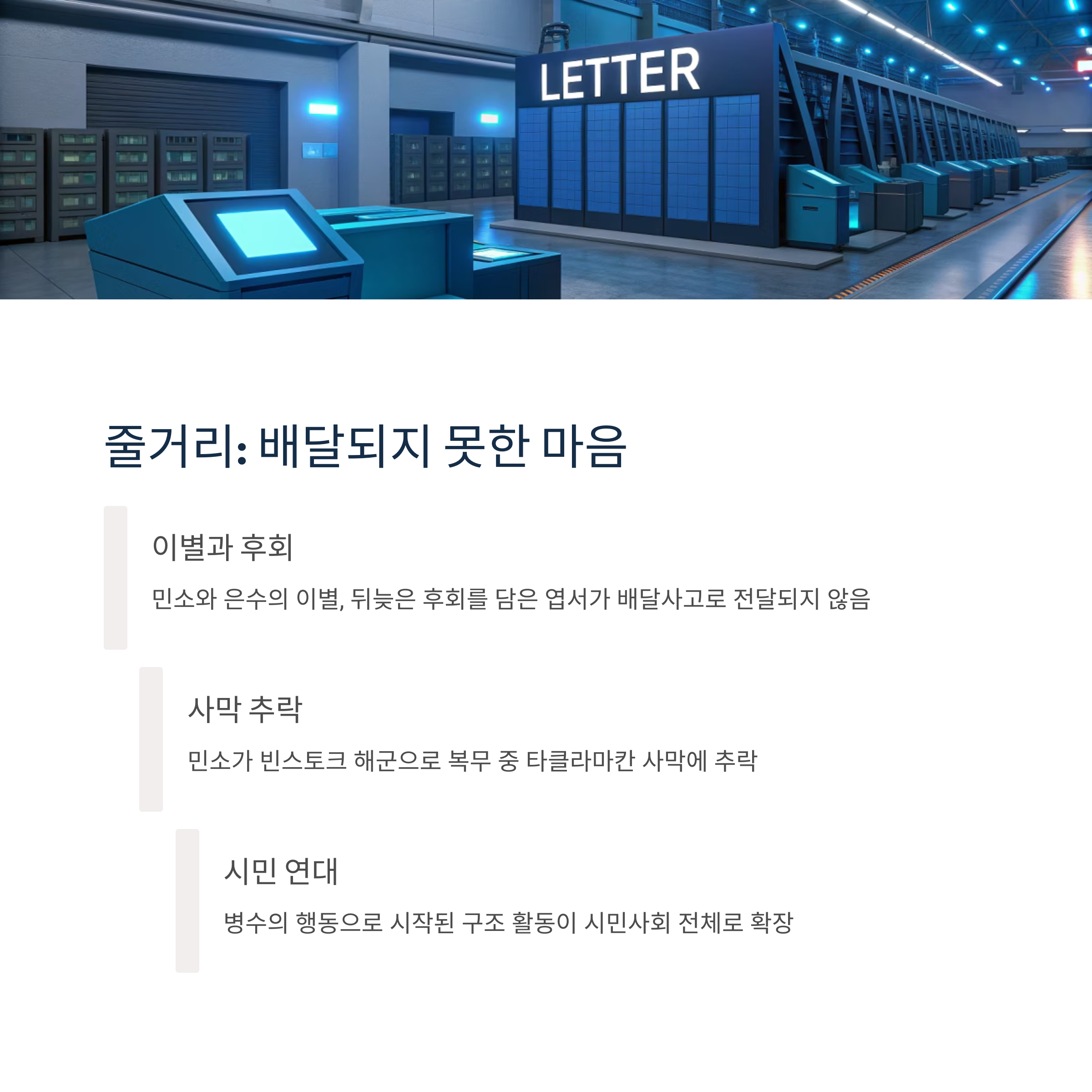시간이 흐른 후 민소는 빈스토크 해군에 입대해 복무하던 중 타클라마칸 사막에 추락하게 된다. 정부는 정치적 이유로 구조를 미루고, 결국 과거 엽서를 제대로 전달하지 못했던 병수가 뒤늦게 은수에게 편지를 전하면서, 이 구조가 개인에서 시민사회 전체로 확장되는 계기가 된다.