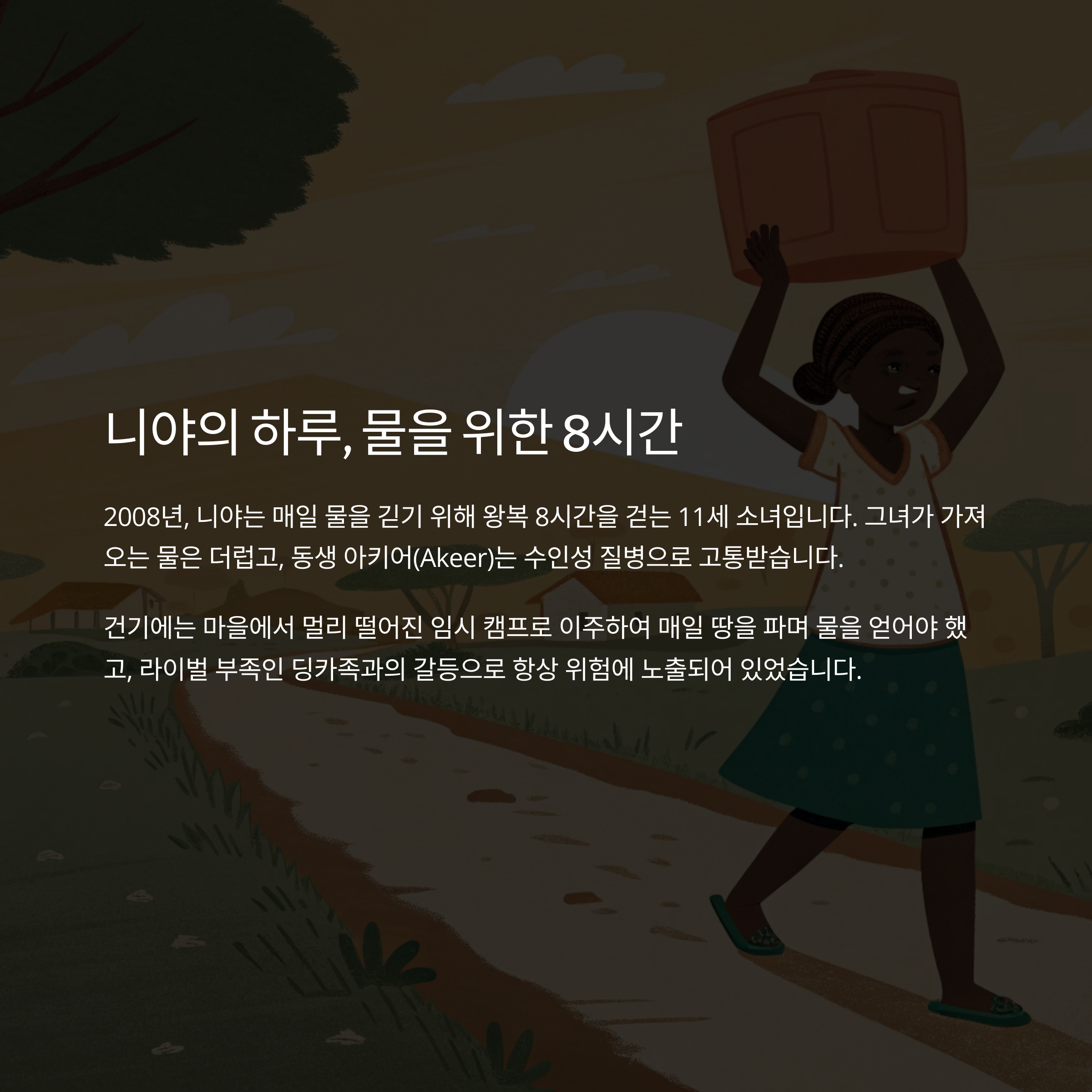 2008년, 니야는 물을 긷기 위해 매일 왕복 8시간을 걷는 11세 누에르족 소녀입니다. 그녀가 가져오는 물은 더럽고 가족은 자주 아픕니다. 특히 동생 아키어(Akeer)는 수인성 질병으로 고통받게 되며, 이는 니야의 가족에게 큰 절망감을 안겨줍니다.