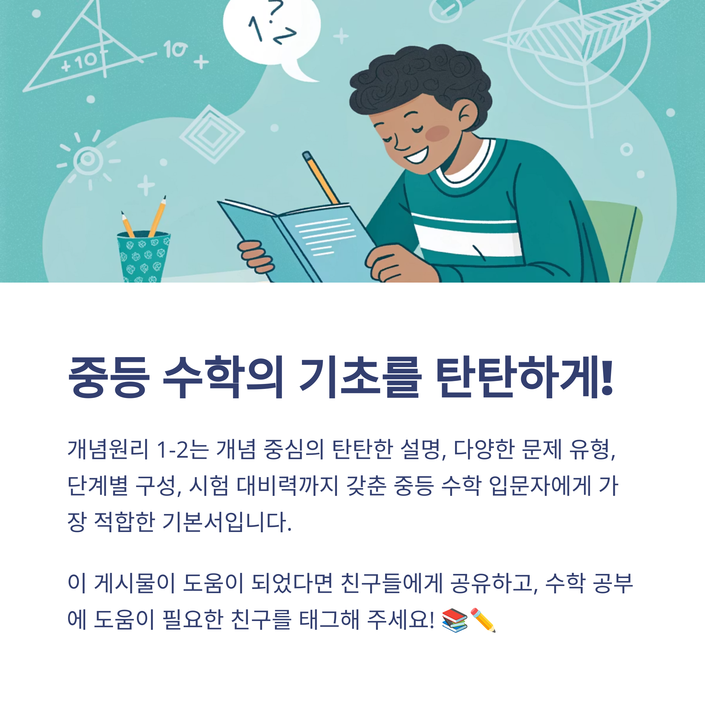 개념원리 1-2는 중등 수학 입문자에게 가장 적합한 기본서 중 하나입니다.