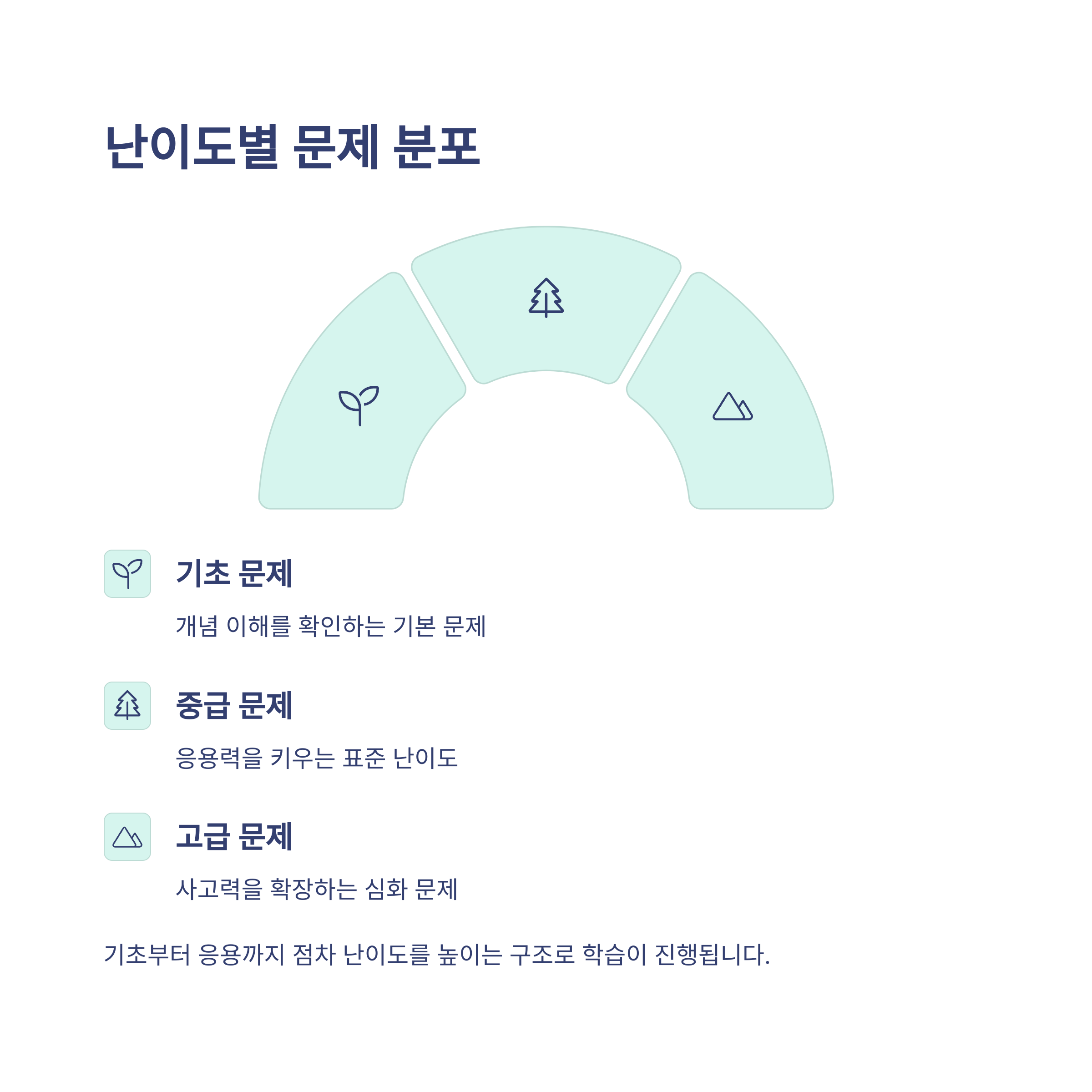 문제 유형은 난이도에 따라 하·중·상으로 고르게 분포되어 있습니다.