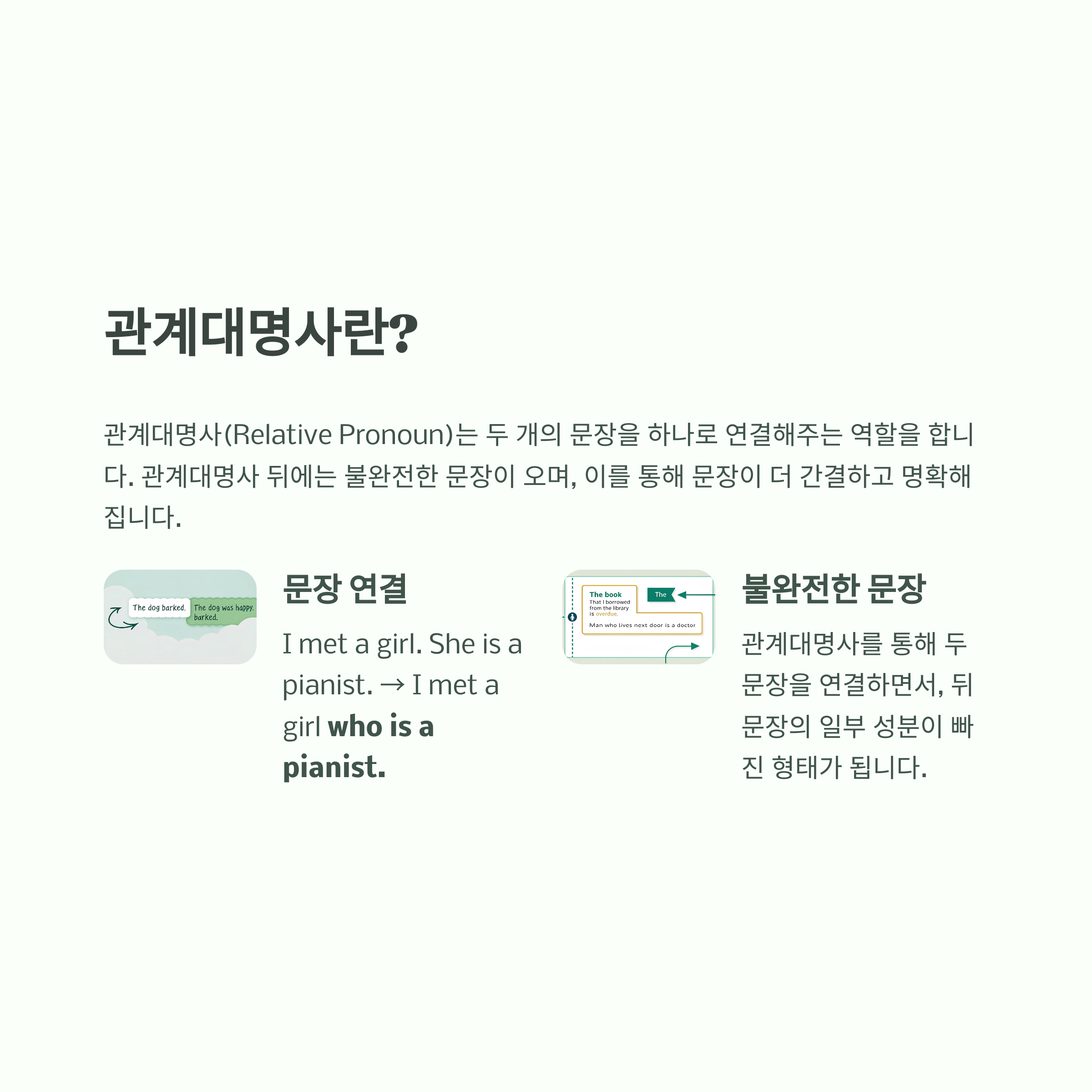 먼저 관계대명사(Relative Pronoun)가 무엇인지 간단히 정리해 보겠습니다. 관계대명사는 두 개의 문장을 하나로 연결해주는 역할을 하며, 뒤에 불완전한 문장이 옵니다. 관계대명사를 사용하면 문장이 더 간결하고 명확해지죠.