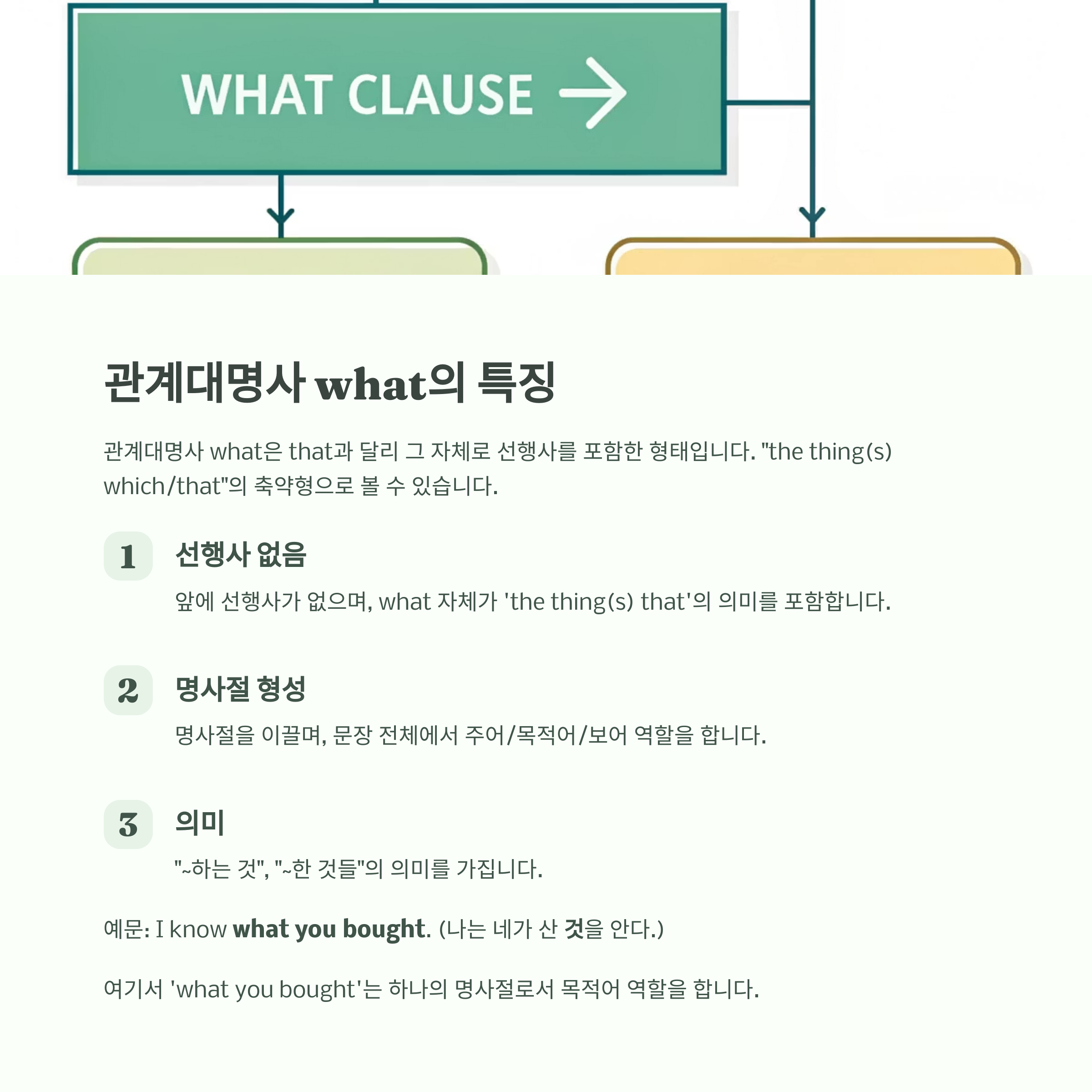 - what은 앞에 명사 없이 그 자체로 “~하는 것”이라는 명사절을 만들며 문장의 주어, 목적어, 보어로 작용합니다.