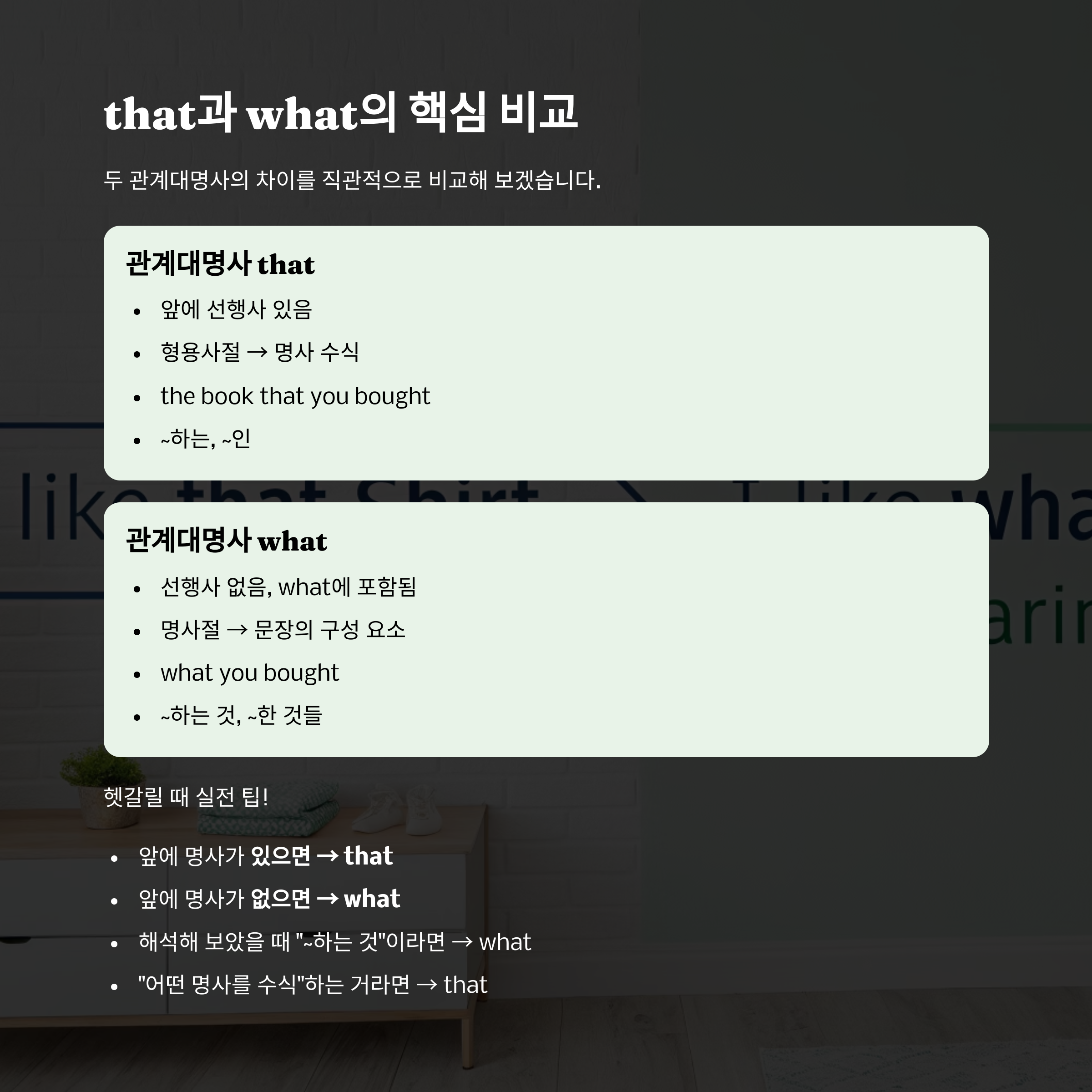 📌 관계대명사 that과 what의 구분이 어려웠다면, 오늘 이 글이 여러분의 영어 실력 향상에 큰 도움이 되었기를 바랍니다.