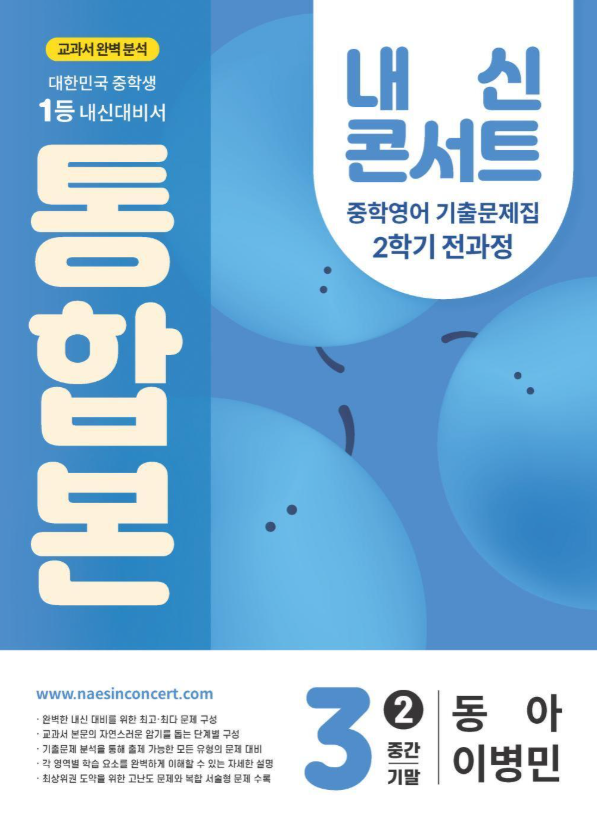 중학교 3학년 2학기 영어 내신을 준비하는 학생들에게 가장 많이 추천되는 문제집 중 하나가 바로 ‘내신콘서트 중3-2 통합본 (동아 이병민)’입니다. 이 교재는 2025년 최신 교육과정에 맞춰 제작된 것으로, 실제 시험에 자주 등장하는 핵심 어휘, 문법, 독해, 서술형 문제 등을 단원별로 체계적으로 학습할 수 있도록 구성되어 있습니다.
