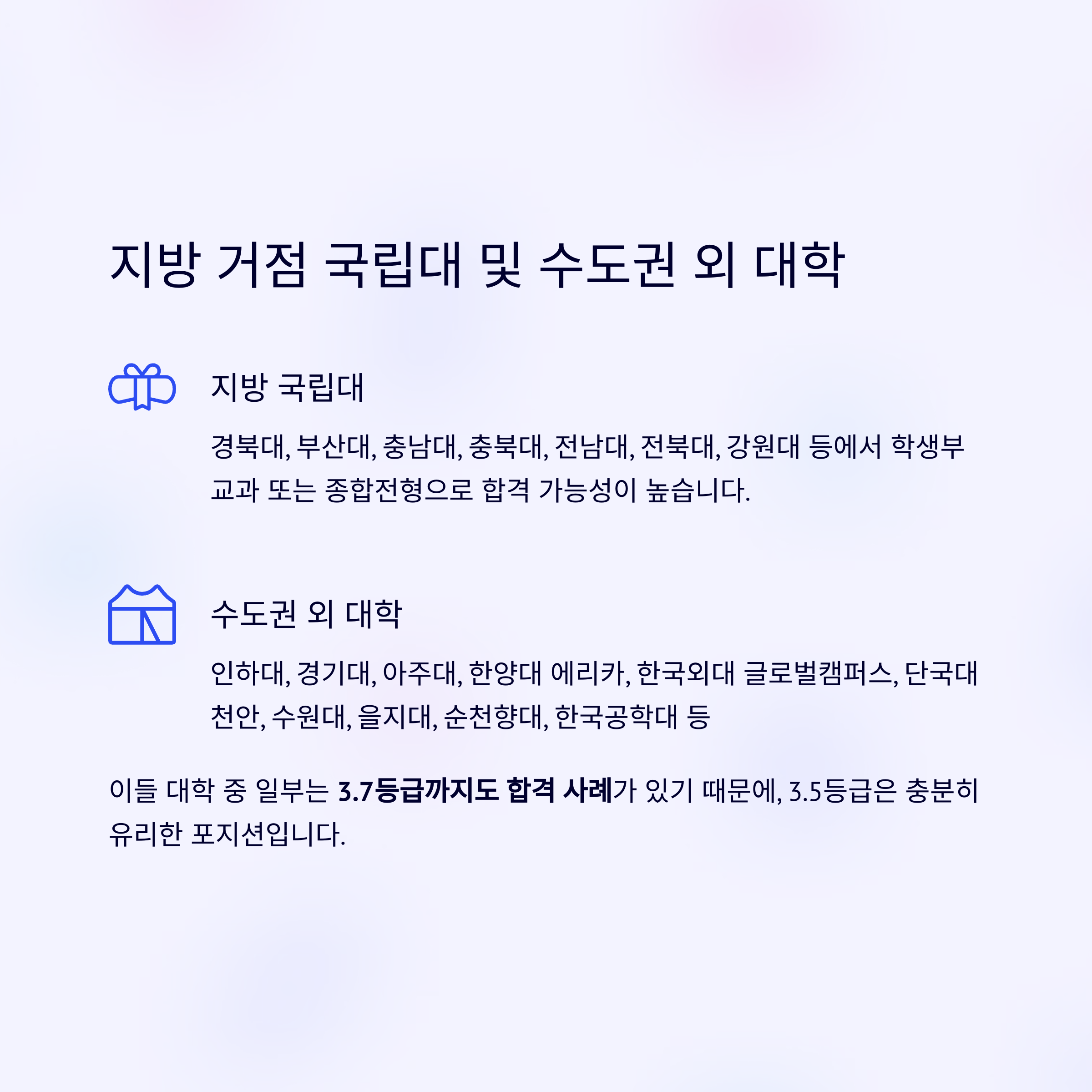 내신 3.5등급으로는 지방 주요 국립대 진학도 현실적입니다. 아래 대학들은 학생부교과 또는 종합전형에서 합격 가능성이 높습니다.