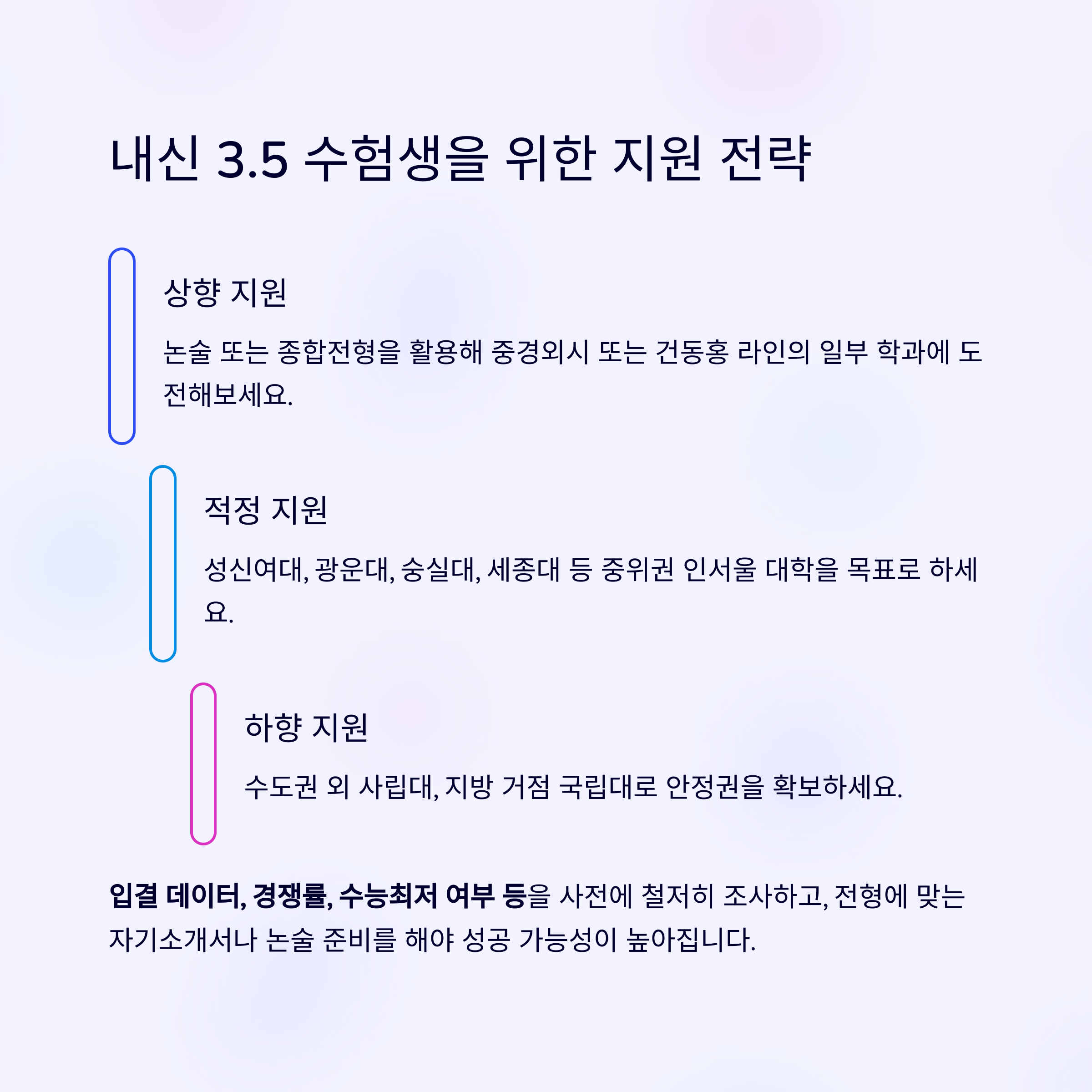 내신 3.5등급, 결코 낮은 등급이 아닙니다. 전략적으로 전형을 선택하고, 자신의 비교과 강점을 활용하며, 수능과 논술까지 대비한다면 인서울 진학은 물론, 이름 있는 국립대 진학도 충분히 가능합니다. 입시는 정보전입니다. 본인의 상황을 정확히 파악하고, 유리한 전형을 선택해 똑똑하게 준비하세요!