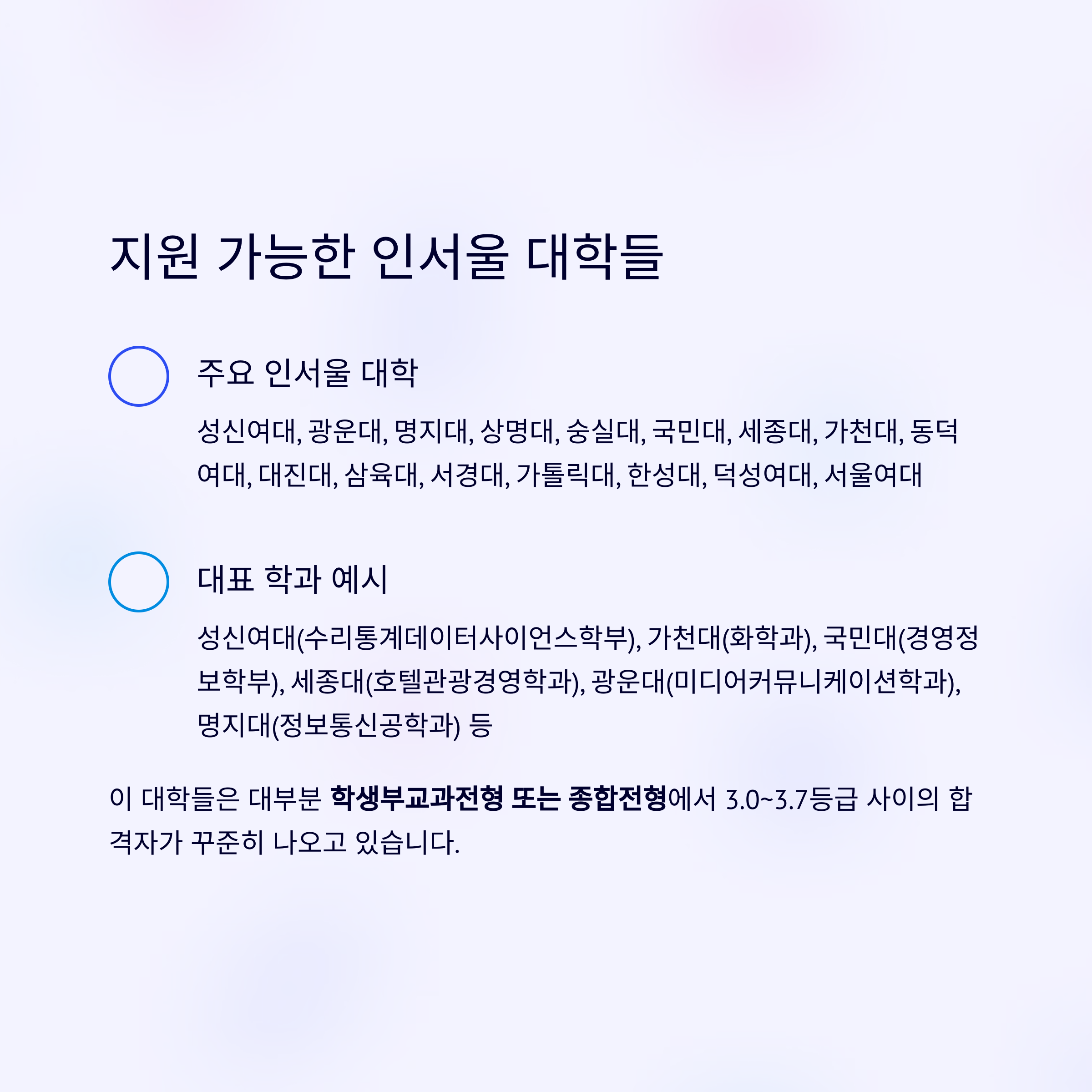 이 대학들은 대부분 학생부교과전형 또는 종합전형에서 3.0~3.7등급 사이의 합격자가 꾸준히 나오고 있습니다.