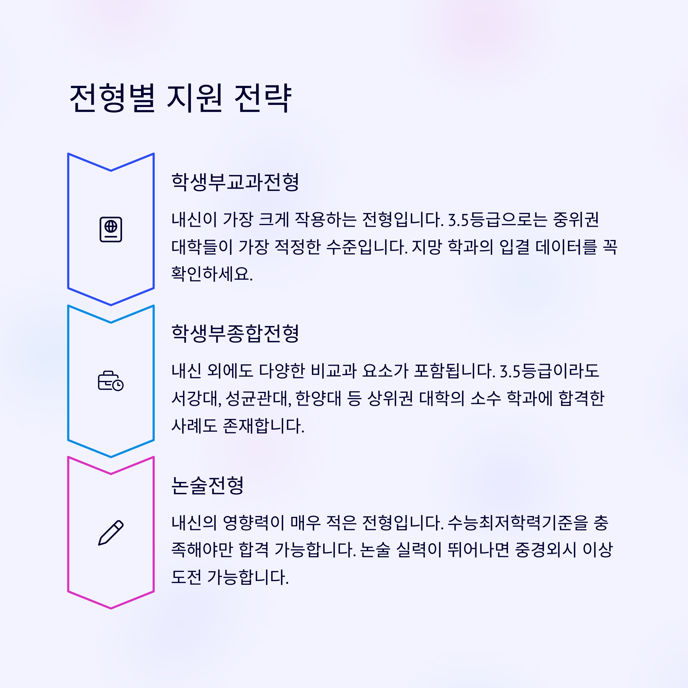 입결 데이터, 경쟁률, 수능최저 여부 등을 사전에 철저히 조사하고, 전형에 맞는 자기소개서나 논술 준비를 해야 성공 가능성이 높아집니다.