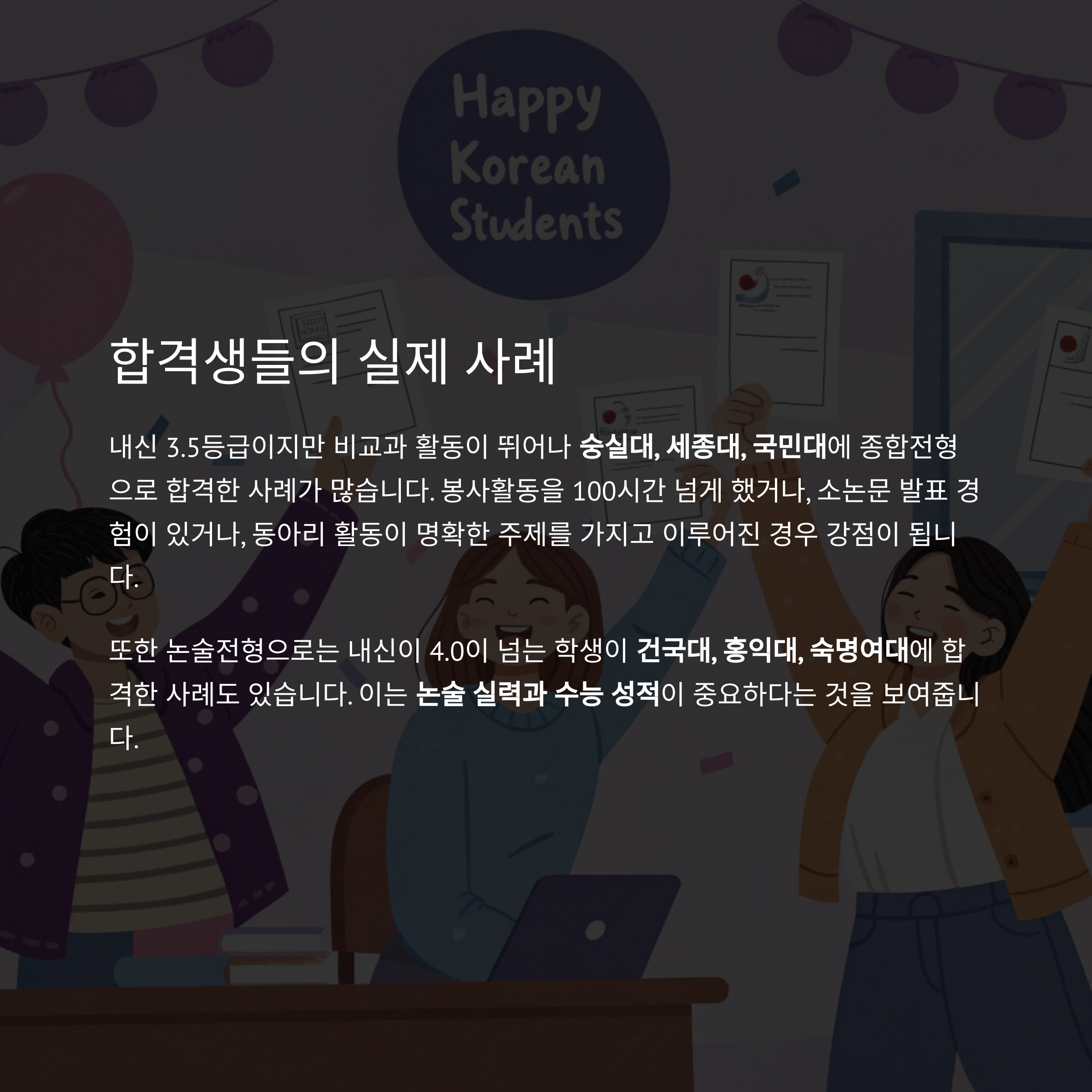 또한 논술전형으로는 내신이 4.0이 넘는 학생이 건국대, 홍익대, 숙명여대에 합격한 사례도 있습니다. 이는 논술 실력과 수능 성적이 중요하다는 것을 보여줍니다.