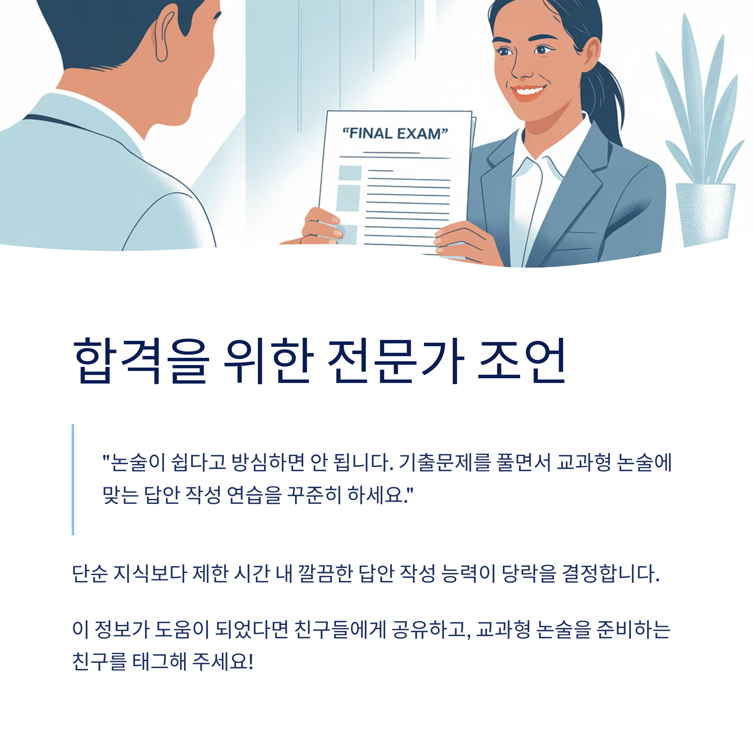 입시 전문가들은 "논술이 쉽다고 방심하면 안 된다"고 강조합니다. 기출문제를 풀어보면서 교과형 논술에 맞는 답안을 작성하는 연습을 꾸준히 해야 합니다. 단순히 지식을 아는 것보다, 시험장에서 제한 시간 내에 답안을 깔끔하게 작성할 수 있는 실전력이 당락을 가릅니다.