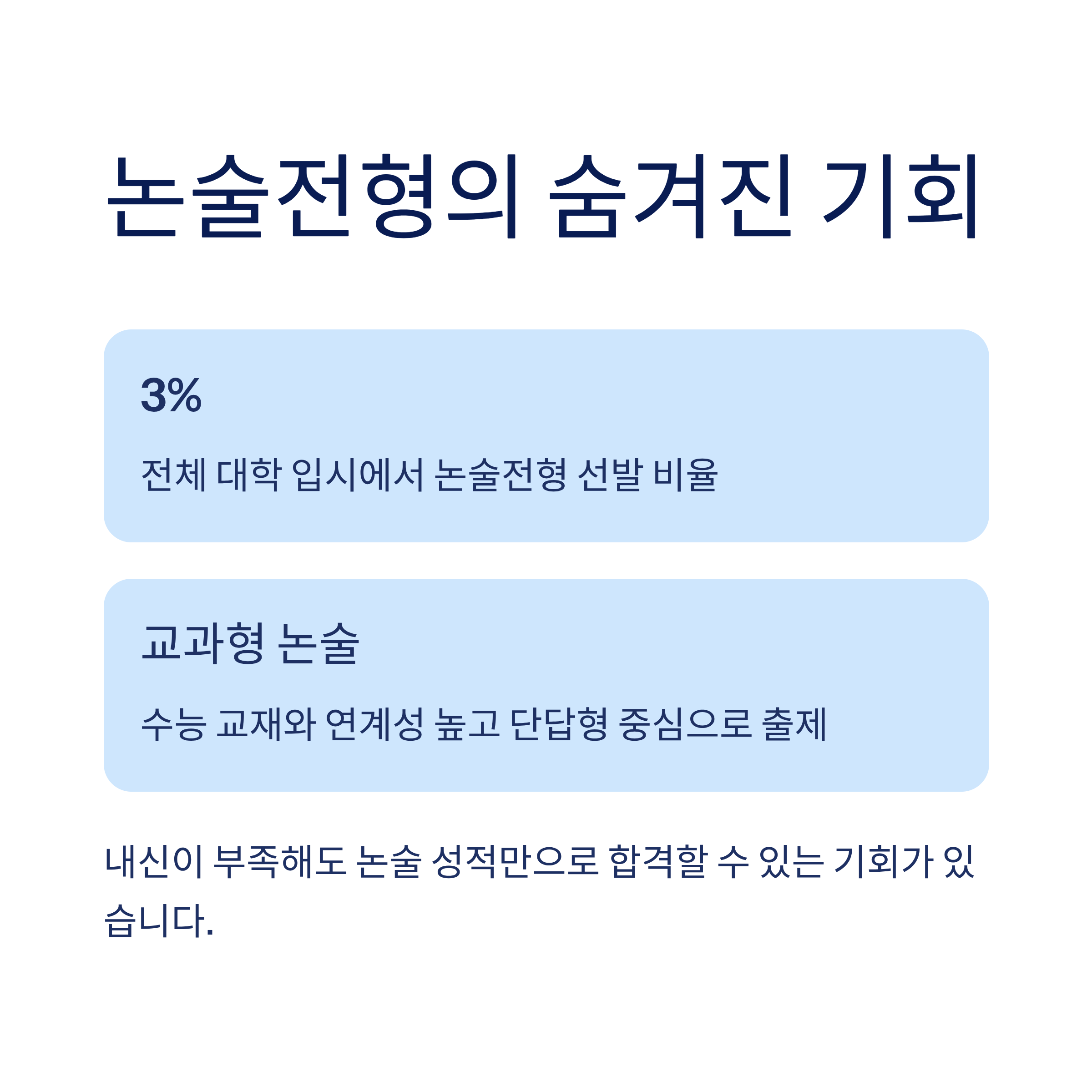 대학 입시에서 논술전형은 전체 선발 비율이 3% 내외로 적지만, 내신이 낮아도 합격할 수 있다는 점에서 매년 치열한 경쟁률을 보이고 있습니다. 특히 교과형(약술형) 논술은 수능 교재와 연계성이 높고 단답형 중심으로 출제돼 수능 준비와 병행하기 좋다는 장점이 있습니다. 그렇다면 교과 성적이 부족한 학생들은 어떻게 준비해야 합격 가능성을 높일 수 있을까요?