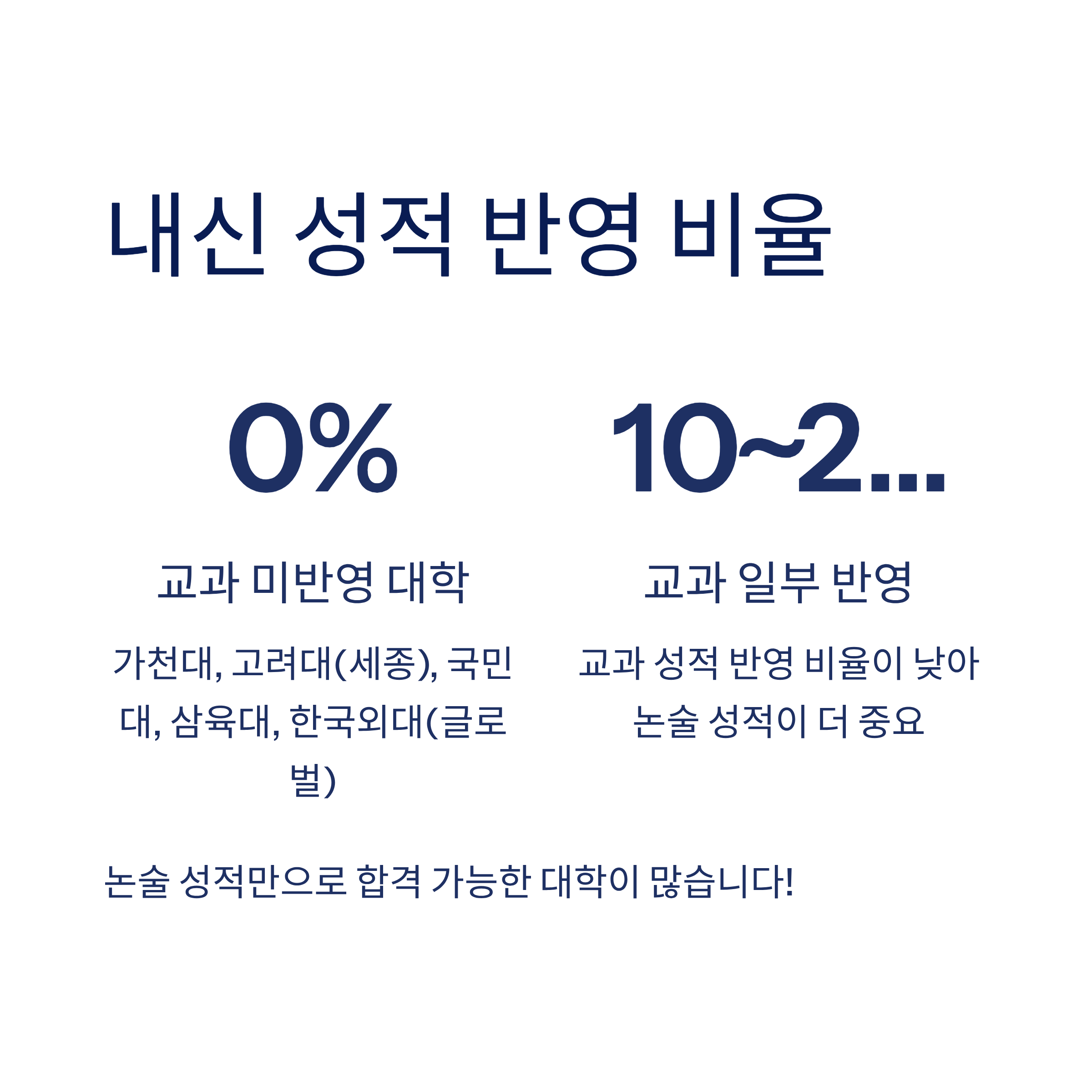 일부 대학은 교과 성적을 아예 반영하지 않고 논술 점수만으로 선발합니다. 가천대, 고려대(세종), 국민대, 삼육대, 한국외대(글로벌) 등이 이에 해당합니다. 교과 성적을 반영하는 대학도 비율이 10~20%로 낮아, 실제로는 논술 성적의 영향력이 훨씬 큽니다.