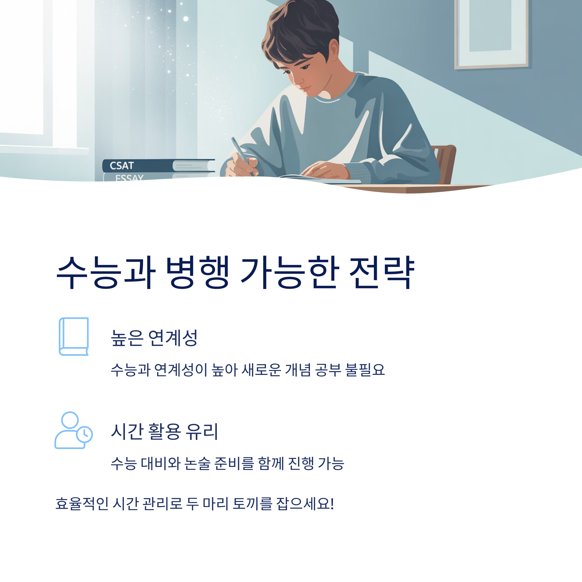 교과형 논술은 수능과 연계성이 높아 따로 새로운 개념을 공부할 필요가 거의 없습니다. 국어는 지문 분석과 요약, 수학은 개념 활용과 풀이 과정을 간결하게 정리하는 연습을 하면 됩니다. 수능 대비와 논술 준비를 함께 가져갈 수 있다는 점에서 시간 활용에도 유리합니다.