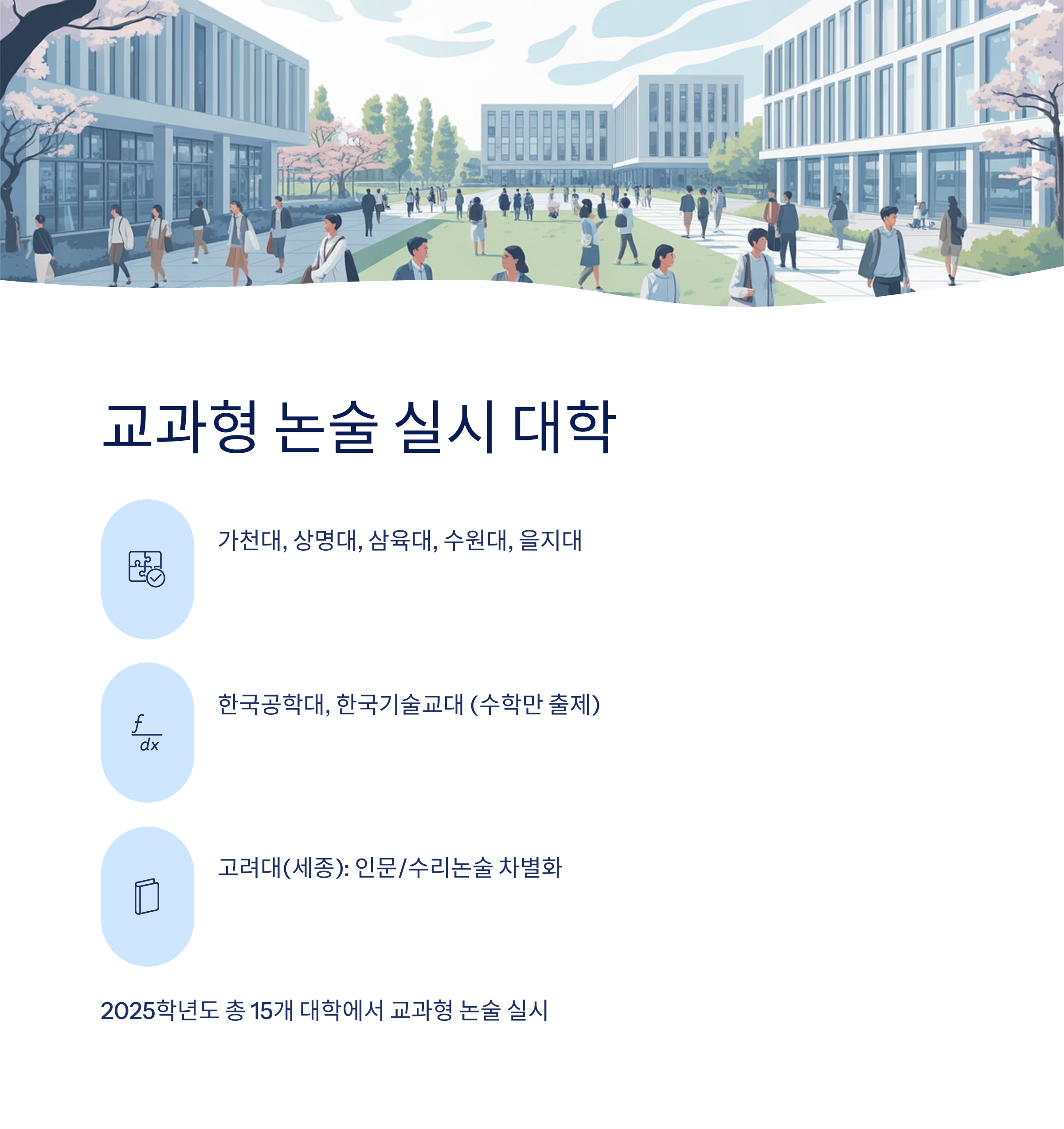 2025학년도에는 국민대를 포함해 총 15개 대학에서 교과형(약술형) 논술을 실시합니다. 가천대, 상명대, 삼육대, 수원대, 을지대 등이 대표적이며, 한국공학대와 한국기술교대는 수학만 출제합니다. 고려대(세종)는 인문계는 인문논술, 자연계는 수리논술을 운영해 차별화된 방식을 보입니다.