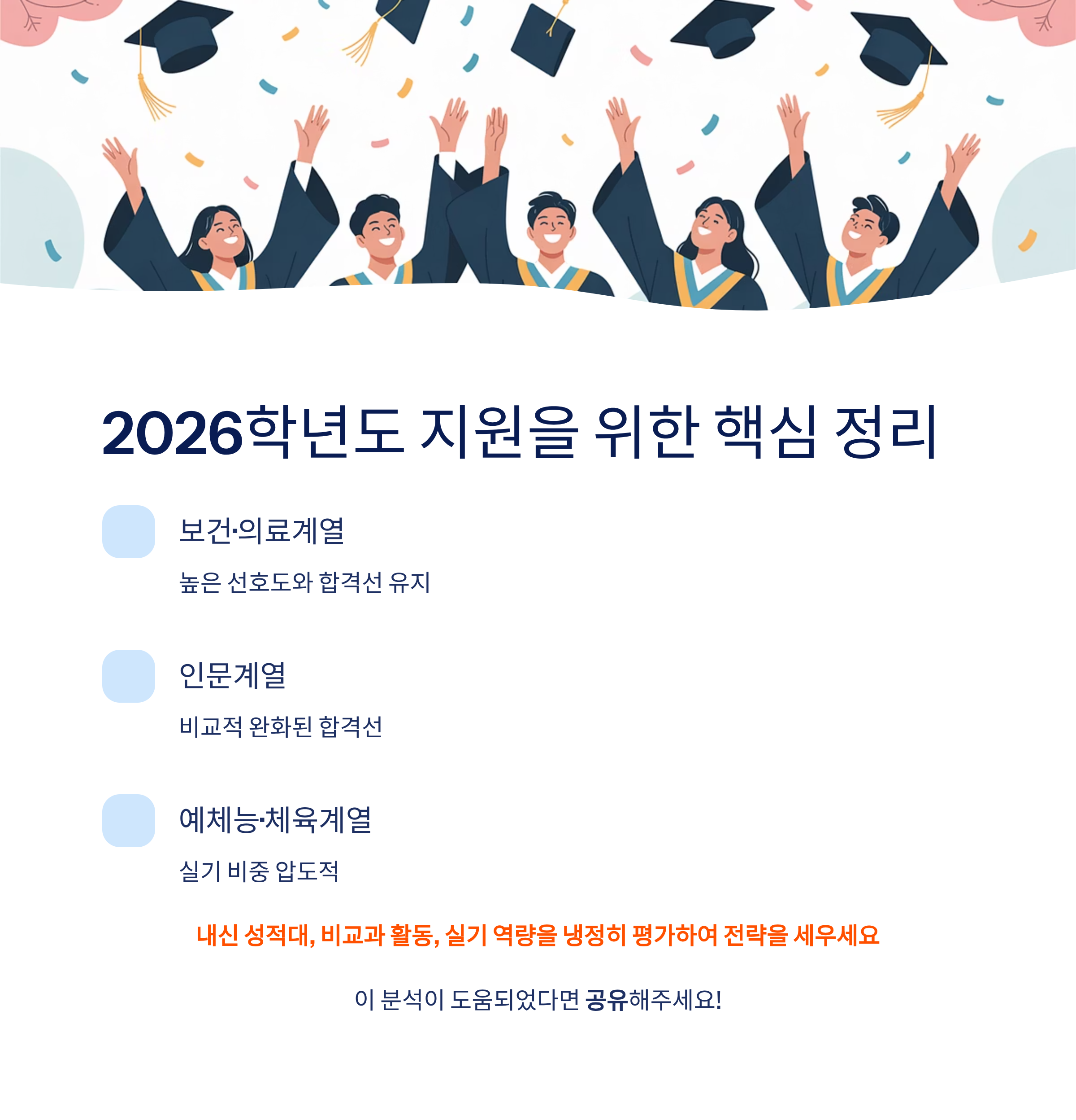앞으로 지원을 고려하는 수험생은 자신의 내신 성적대, 비교과 활동, 실기 역량을 냉정히 평가한 후, 전형별 특성을 고려해 전략을 세워야 합니다.
