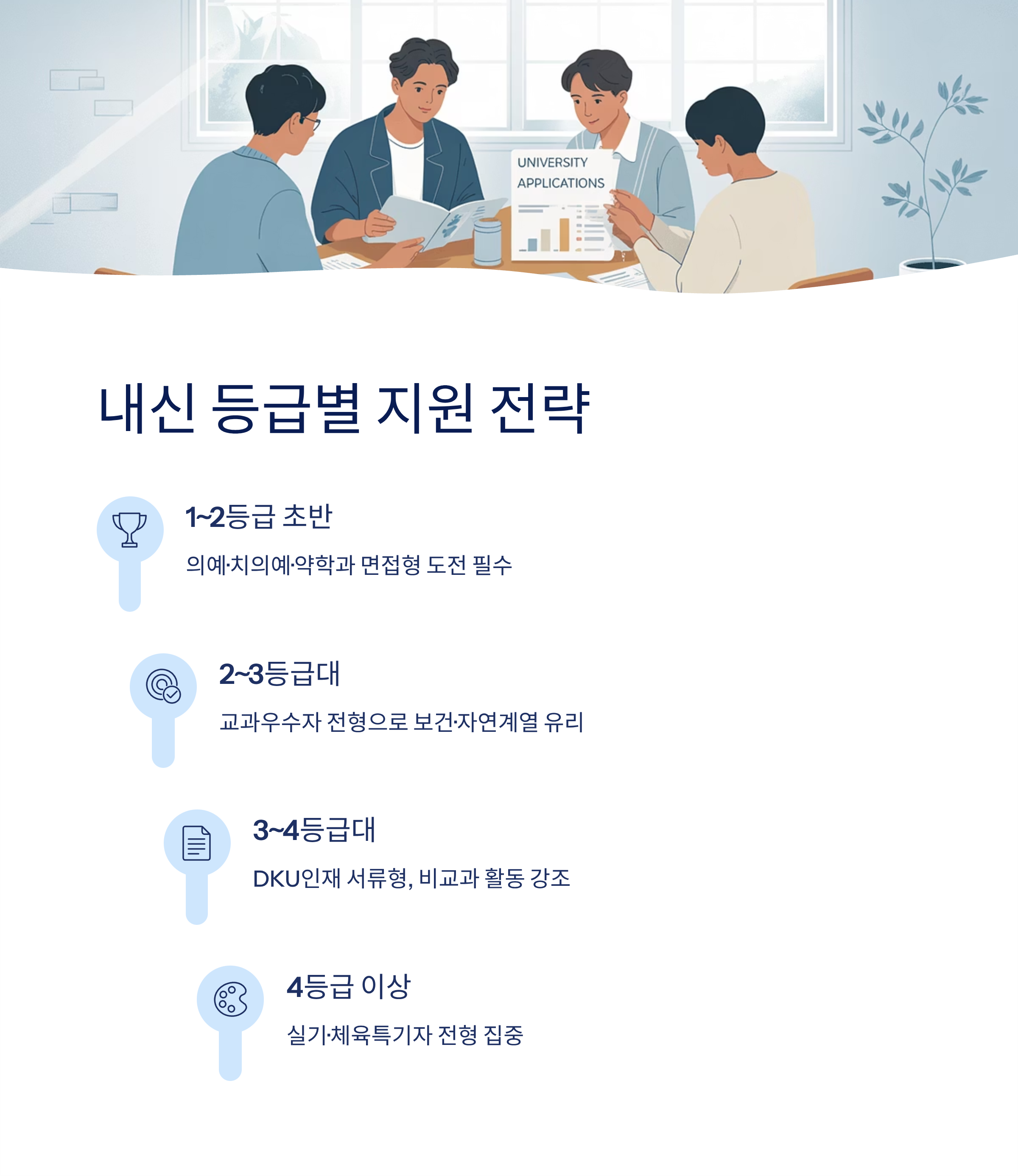 - 내신 1~2등급 초반대 학생들의 치열한 경쟁이 확인됨.