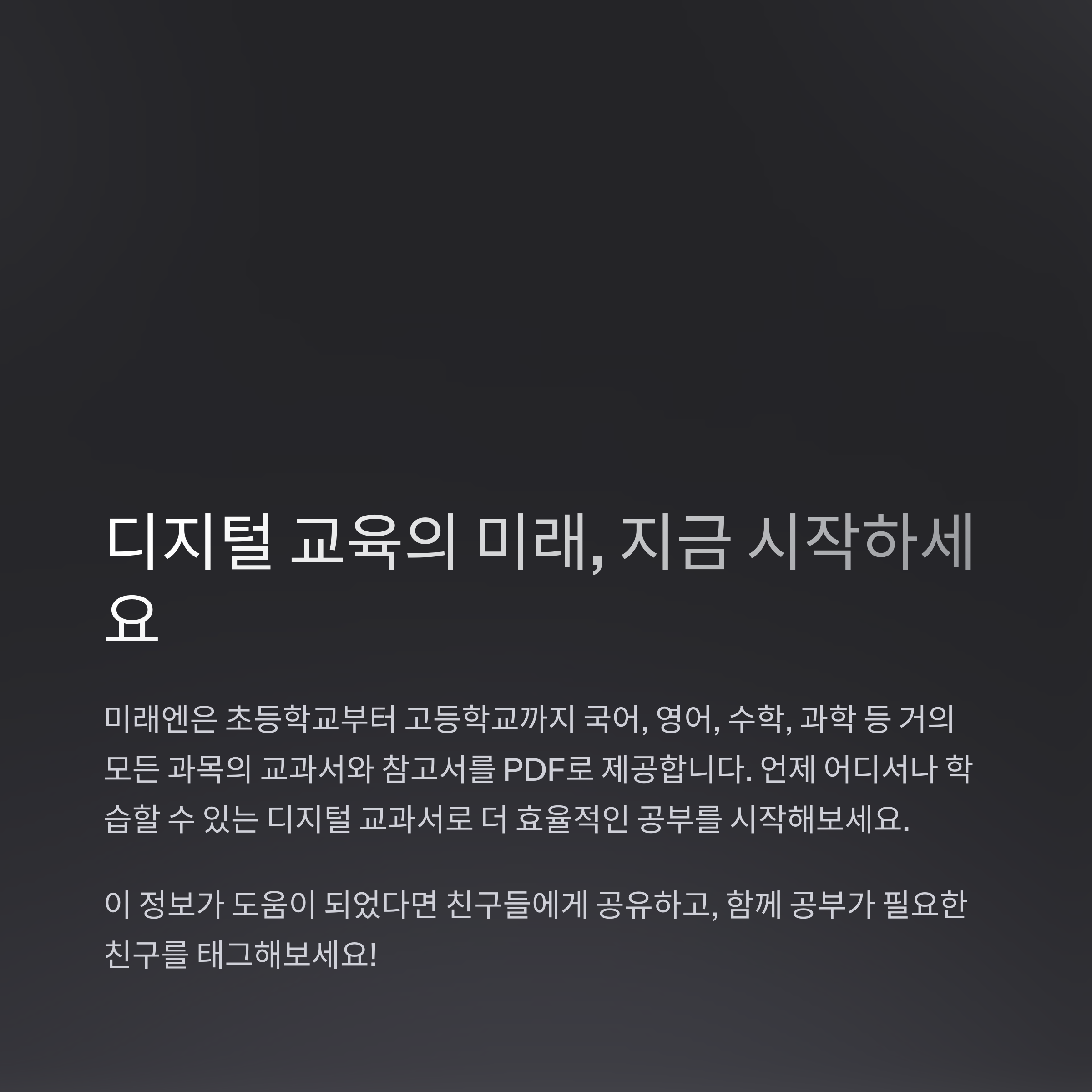 2020년 코로나19 팬데믹 이후, 원격수업과 비대면 학습이 확산되면서 학생들은 더 이상 종이책만으로는 학습을 이어가기 어려운 상황에 직면했습니다. 이에 대응하여 미래엔 출판사는 학생들이 교과서 PDF 저장을 통해 언제 어디서든 학습할 수 있도록 미래엔 엠티처(M-Teacher)와 같은 플랫폼을 통해 전자 교과서를 무료로 제공하고 있습니다.