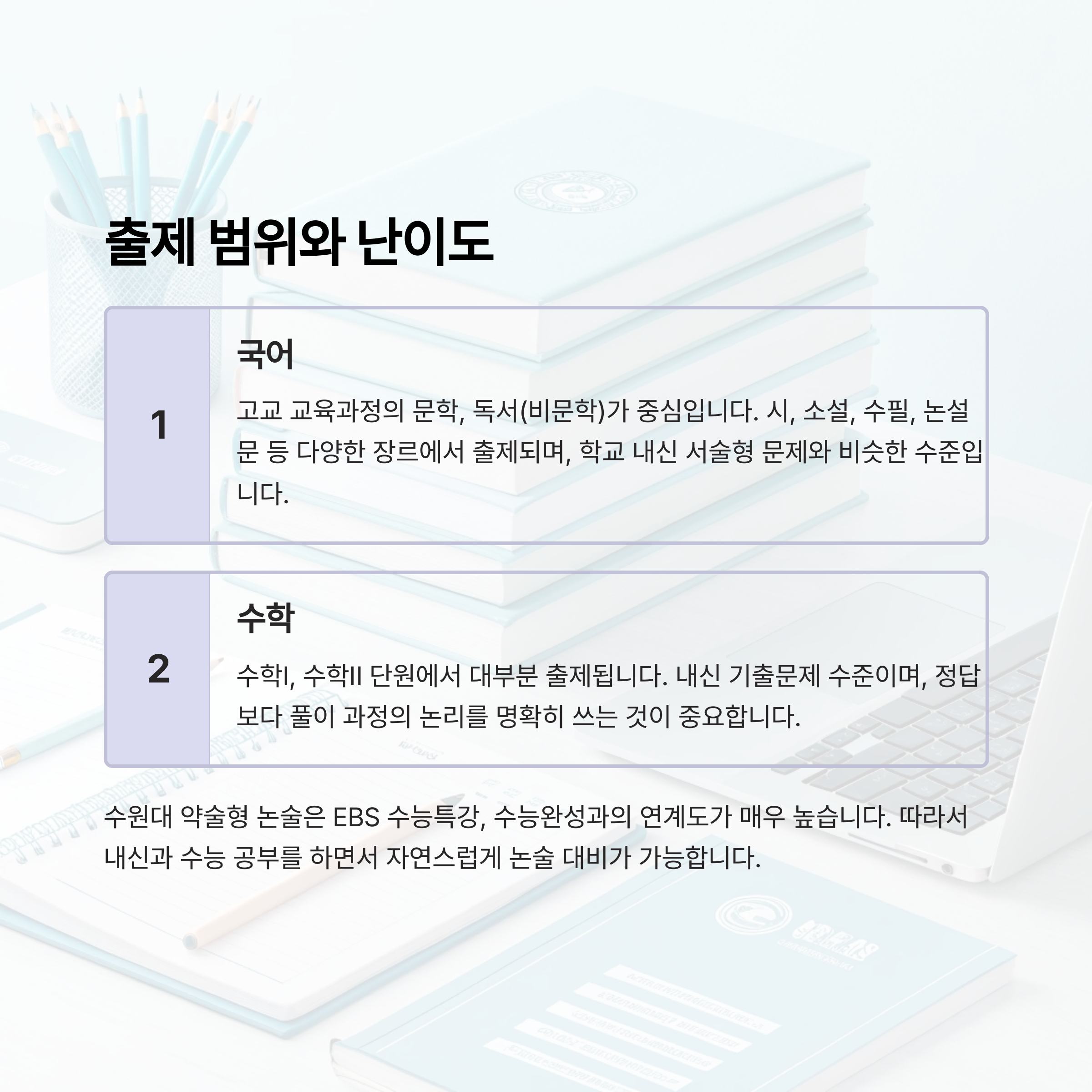 수원대 약술형 논술은 EBS 수능특강, 수능완성과의 연계도가 매우 높습니다. 따라서 내신과 수능 공부를 하면서 자연스럽게 논술 대비가 가능합니다. 별도의 고난도 논술 교재를 따로 풀기보다 학교 교과서, EBS를 철저히 반복하며 핵심 개념을 두세 문장으로 요약하는 훈련이 훨씬 효율적입니다.