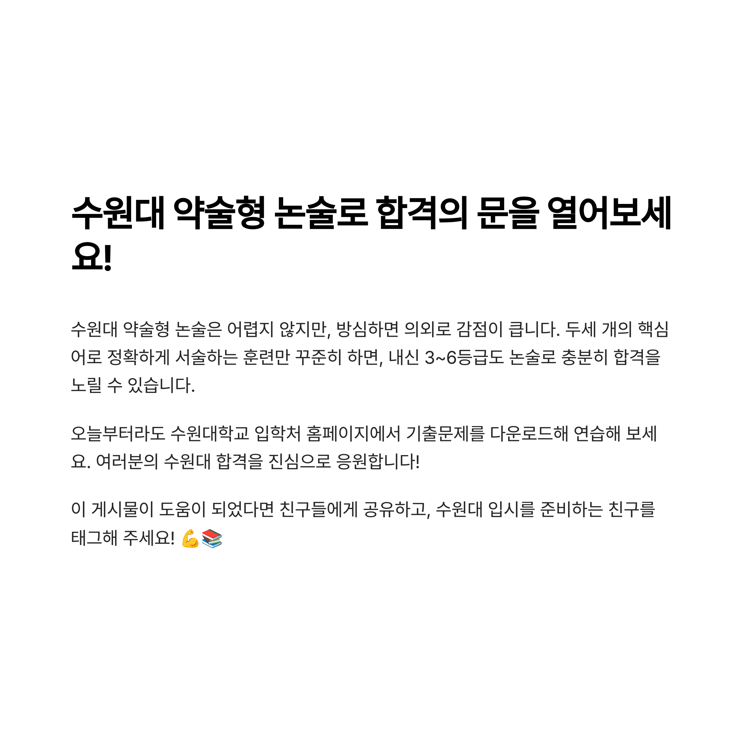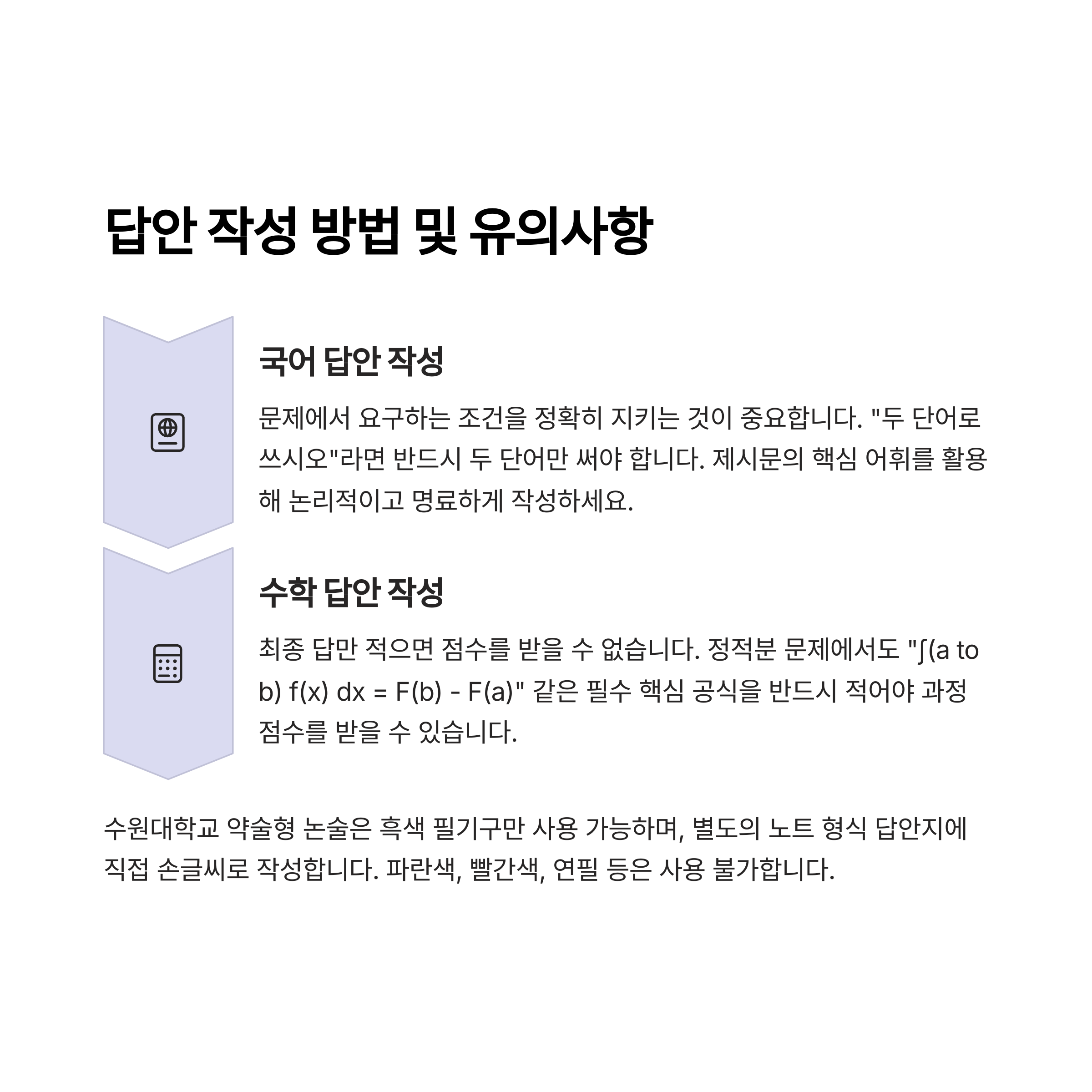 수원대 약술형 논술은 어렵지 않지만, 방심하면 의외로 감점이 큽니다. 두세 개의 핵심어로 정확하게 서술하는 훈련만 꾸준히 하면, 내신 3~6등급도 논술로 충분히 합격을 노릴 수 있습니다.