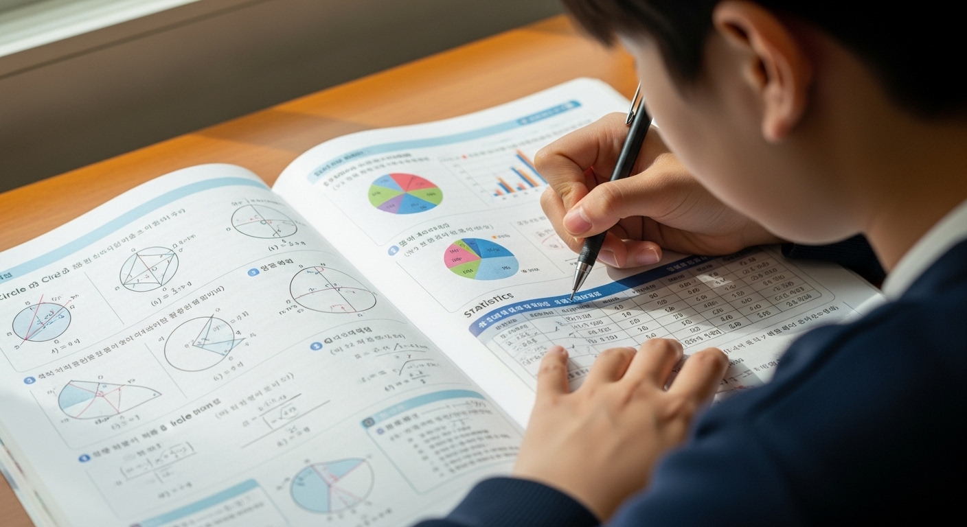 각 단원은 ‘핵심 개념 정리 → 기출 유형 분석 → 난이도별 문제풀이’ 순서로 구성되어 있습니다. 이를 통해 개념 복습과 문제 적용을 한 번에 할 수 있습니다. 특히 원의 성질, 원주각의 활용, 통계 단원은 기말 시험에서 높은 비중을 차지하는 핵심 파트입니다.