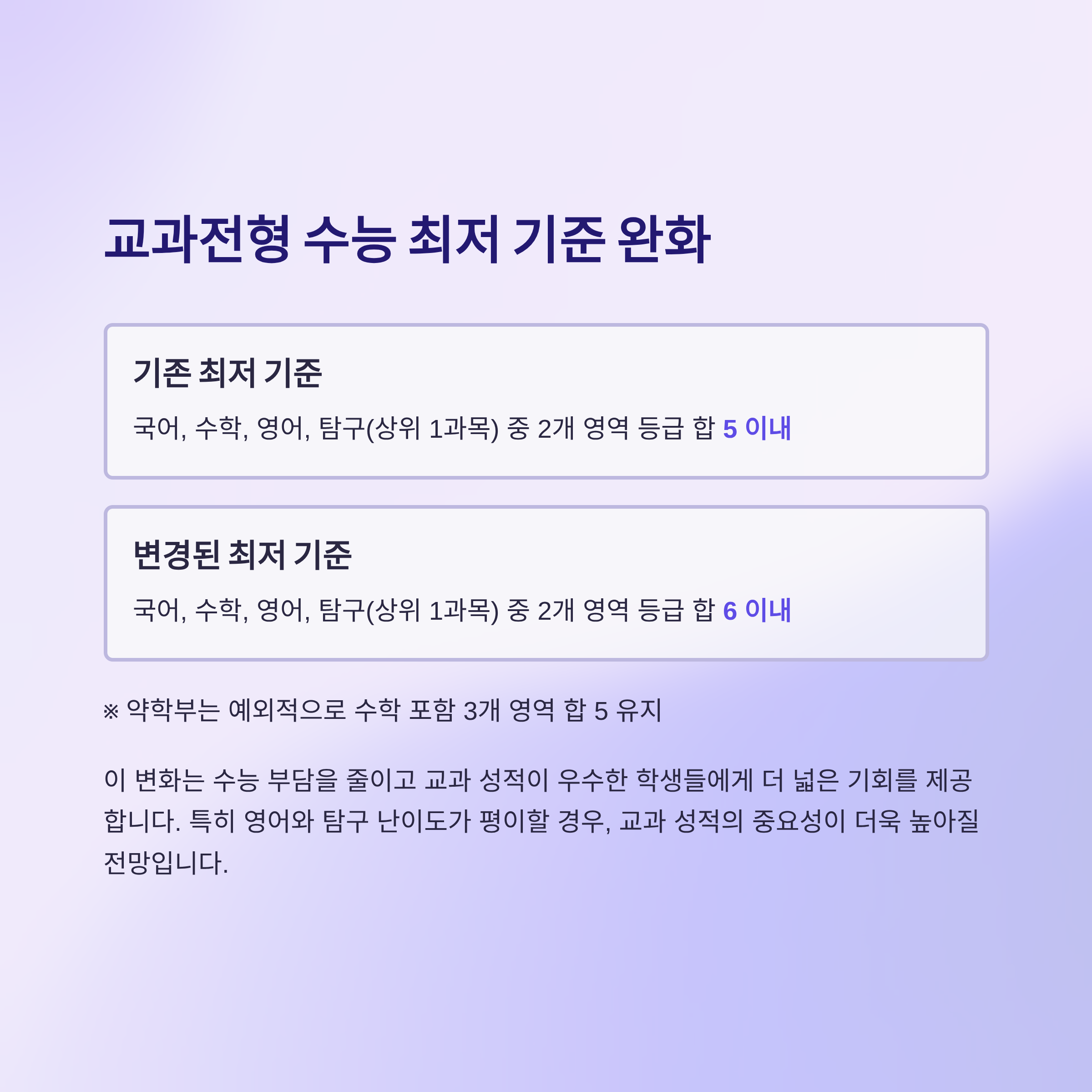 2026학년부터 교과전형에서 적용되는 최저 기준이 완화되었다. 기존에는 국어, 수학, 영어, 탐구(상위 1과목) 중 2개 영역 등급 합 5 이내였으나, 이제는 6 이내로 조정되었다. 약학부를 제외한 모든 학과에 적용되며, 약학부는 여전히 수학 포함 3개 영역 합 5를 유지한다.