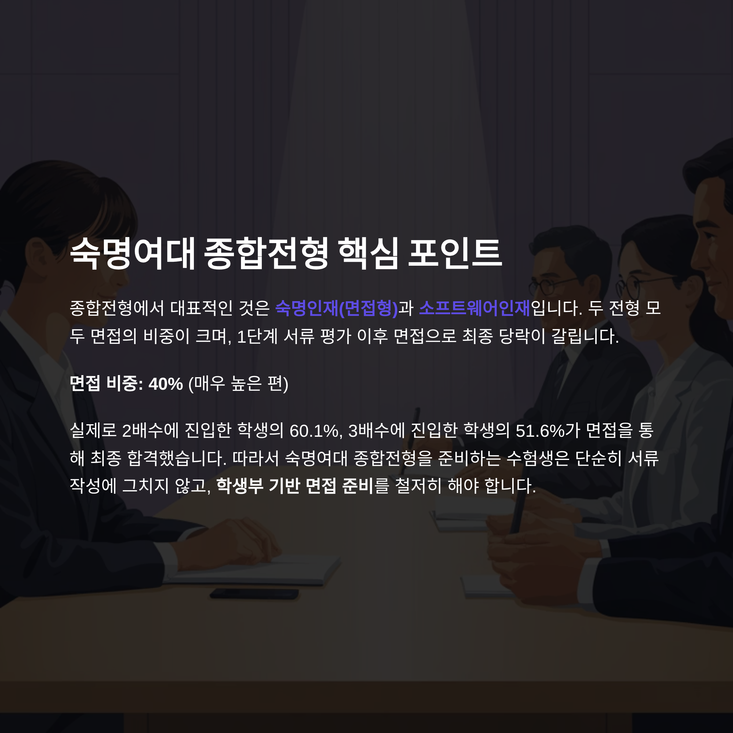 종합전형에서 대표적인 것은 숙명인재(면접형)과 소프트웨어인재이다. 두 전형 모두 면접의 비중이 크며, 1단계 서류 평가 이후 면접으로 최종 당락이 갈린다. 특히 숙명인재(면접형)의 경우, 1단계 서류 평가에서 하위권에 속했더라도 면접 준비가 잘 되어 있다면 합격으로 이어지는 사례가 많았다.