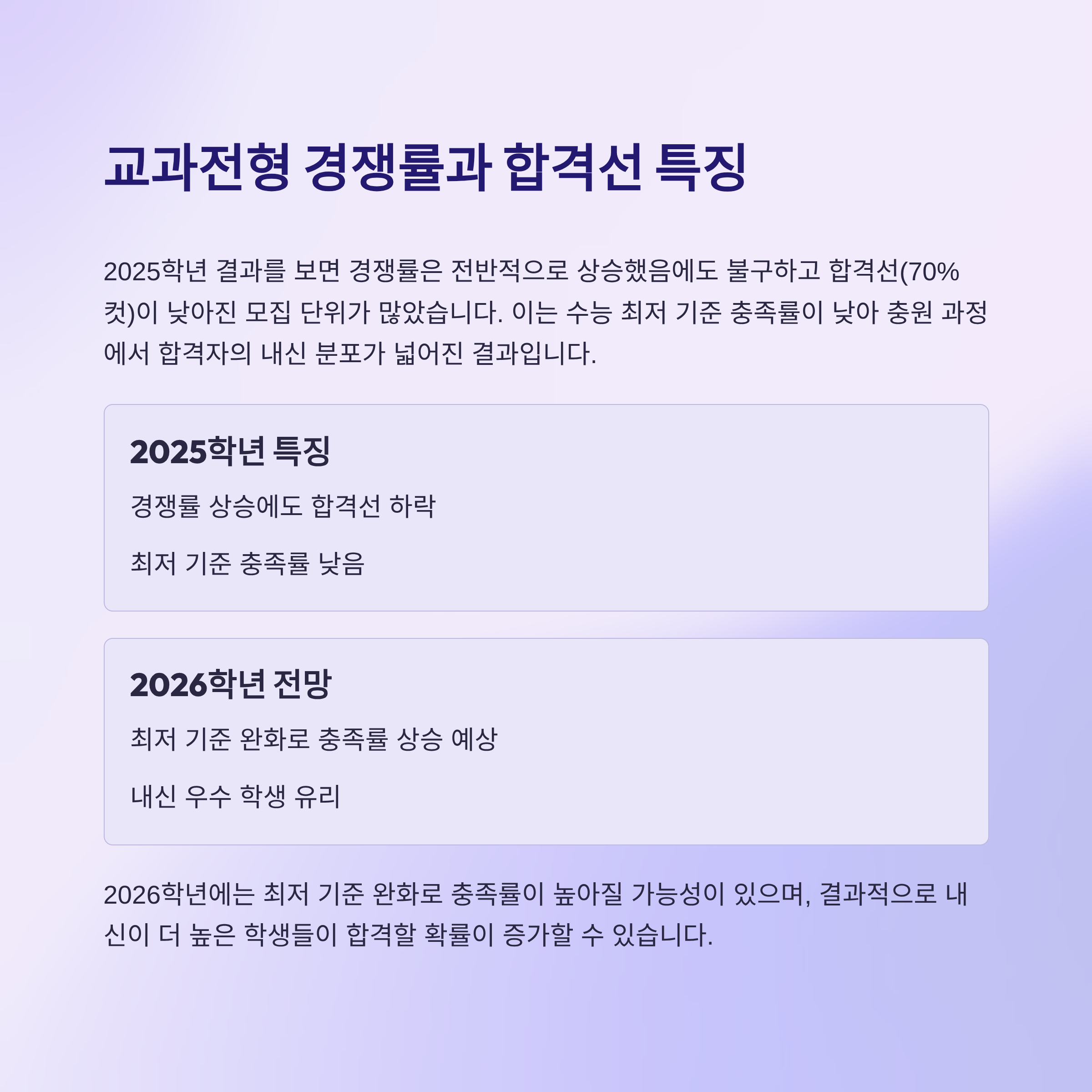 2025학년에는 경쟁률 상승에도 불구하고 최저 기준 완화와 충원 과정으로 인해 합격선이 낮아졌다. 그러나 2026학년에는 최저 기준 완화로 충족률이 오히려 올라가, 내신이 우수한 학생이 유리할 수 있다.