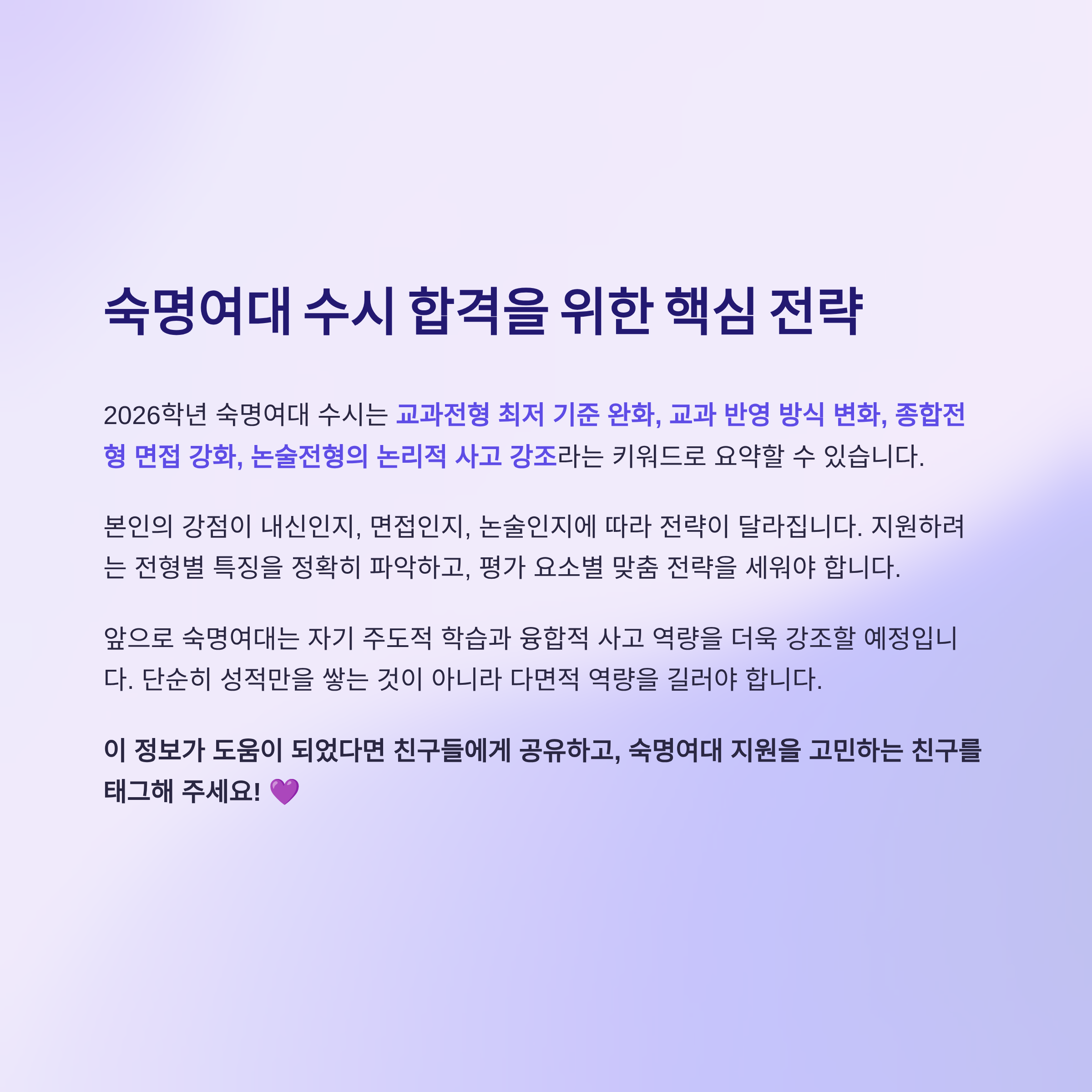 2026학년 숙명여대 수시는 교과전형 최저 기준 완화, 교과 반영 방식 변화, 종합전형 면접 강화, 논술전형의 논리적 글쓰기 강조라는 네 가지 키워드로 정리할 수 있다.