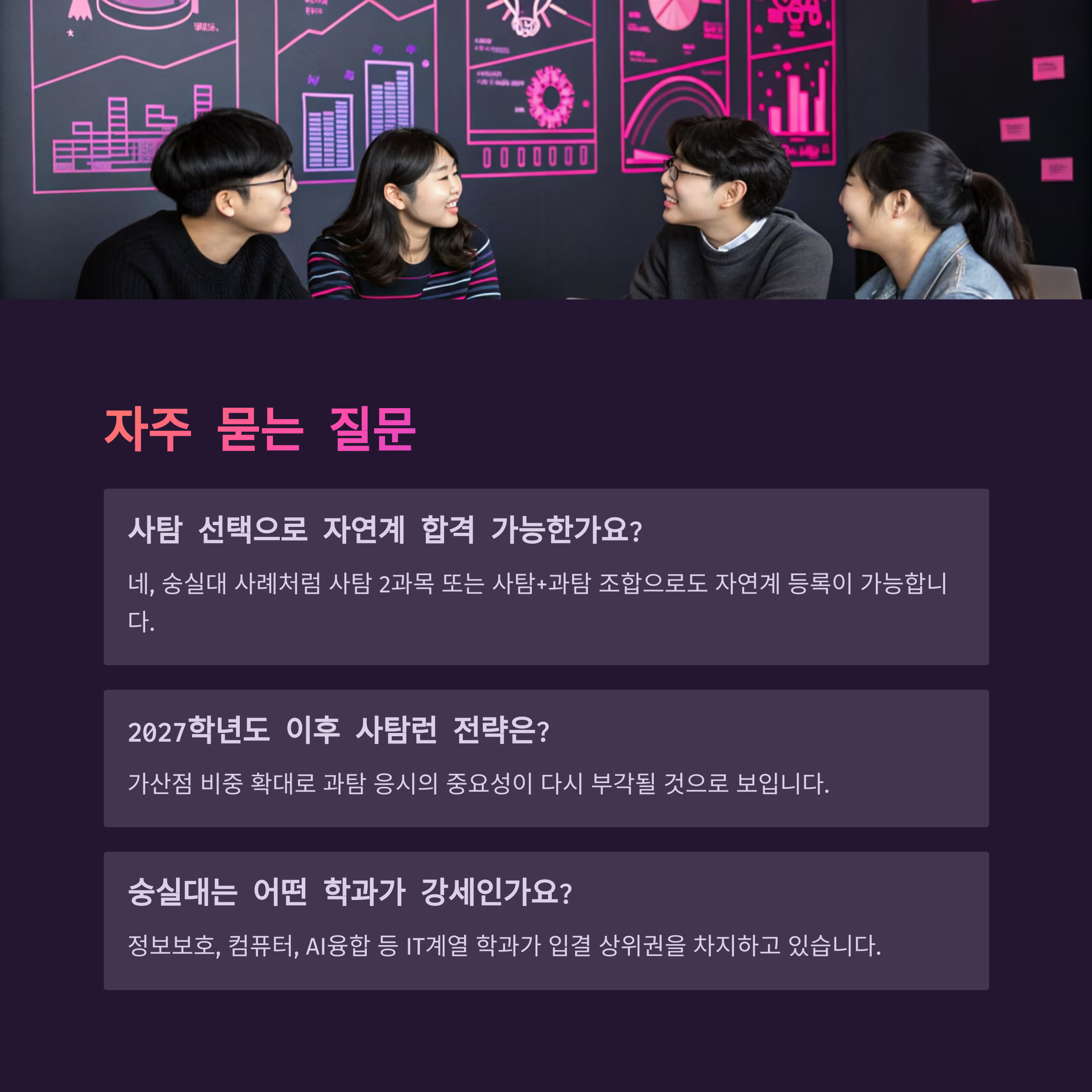 숭실대의 경우 자연계열 정시 등록자의 무려 25%가 사탐을 선택했다는 통계는 이를 명확히 보여줍니다.