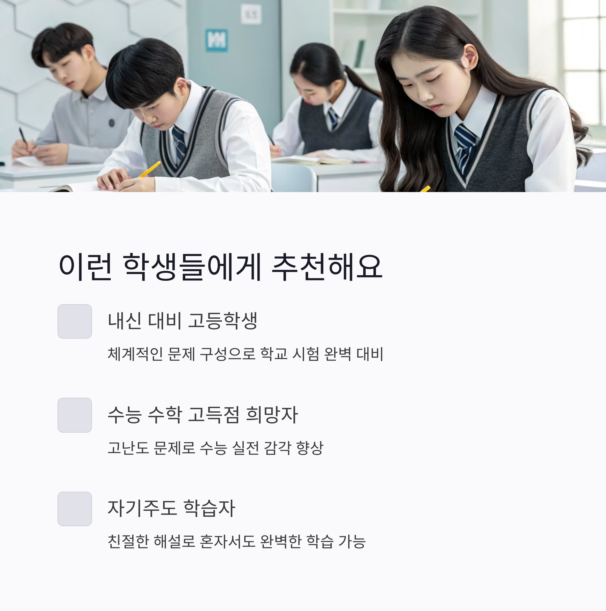 이러한 구조 덕분에 개념을 막 익힌 학생부터, 심화 문제에 도전하는 상위권 학생까지 모두에게 적합한 문제집으로 평가받고 있습니다.
