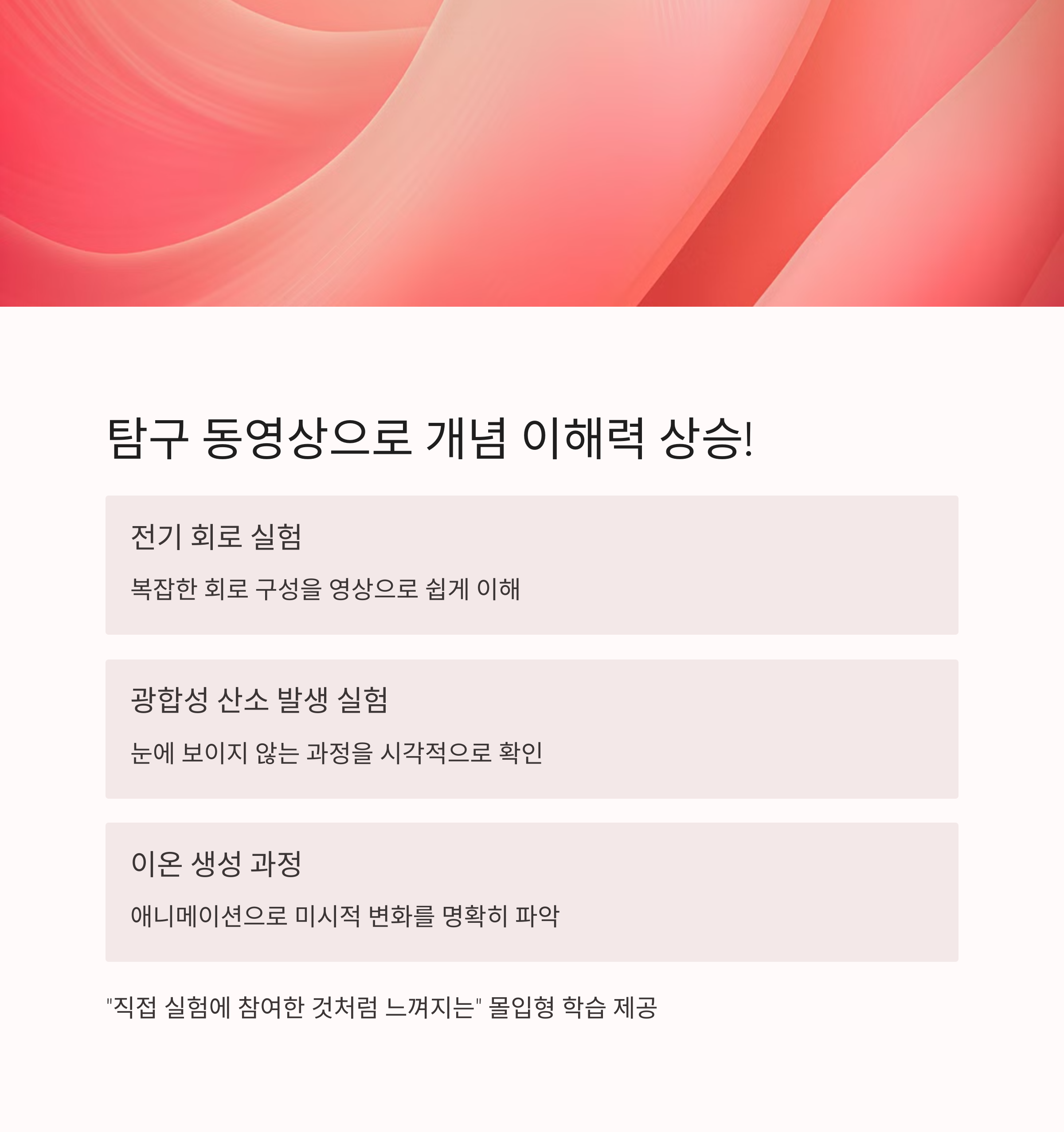 복잡하거나 눈에 잘 안 보이는 원리들을 "영상으로 직접 확인하며 이해할 수 있어" 학습 효율이 높아집니다.