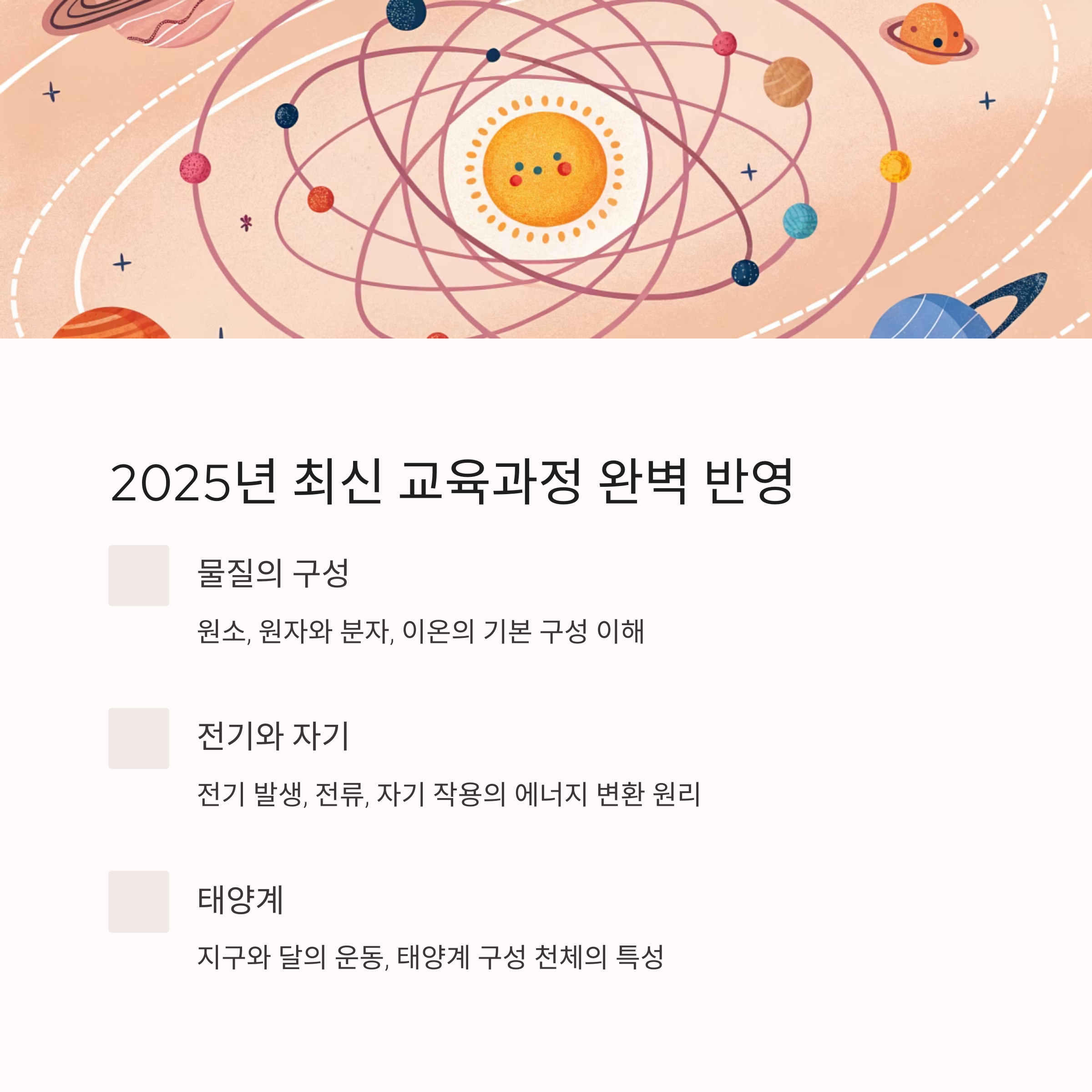 과학에 자신 없는 학생도 기초부터 차근차근 실력을 쌓을 수 있도록 돕는 구조입니다.