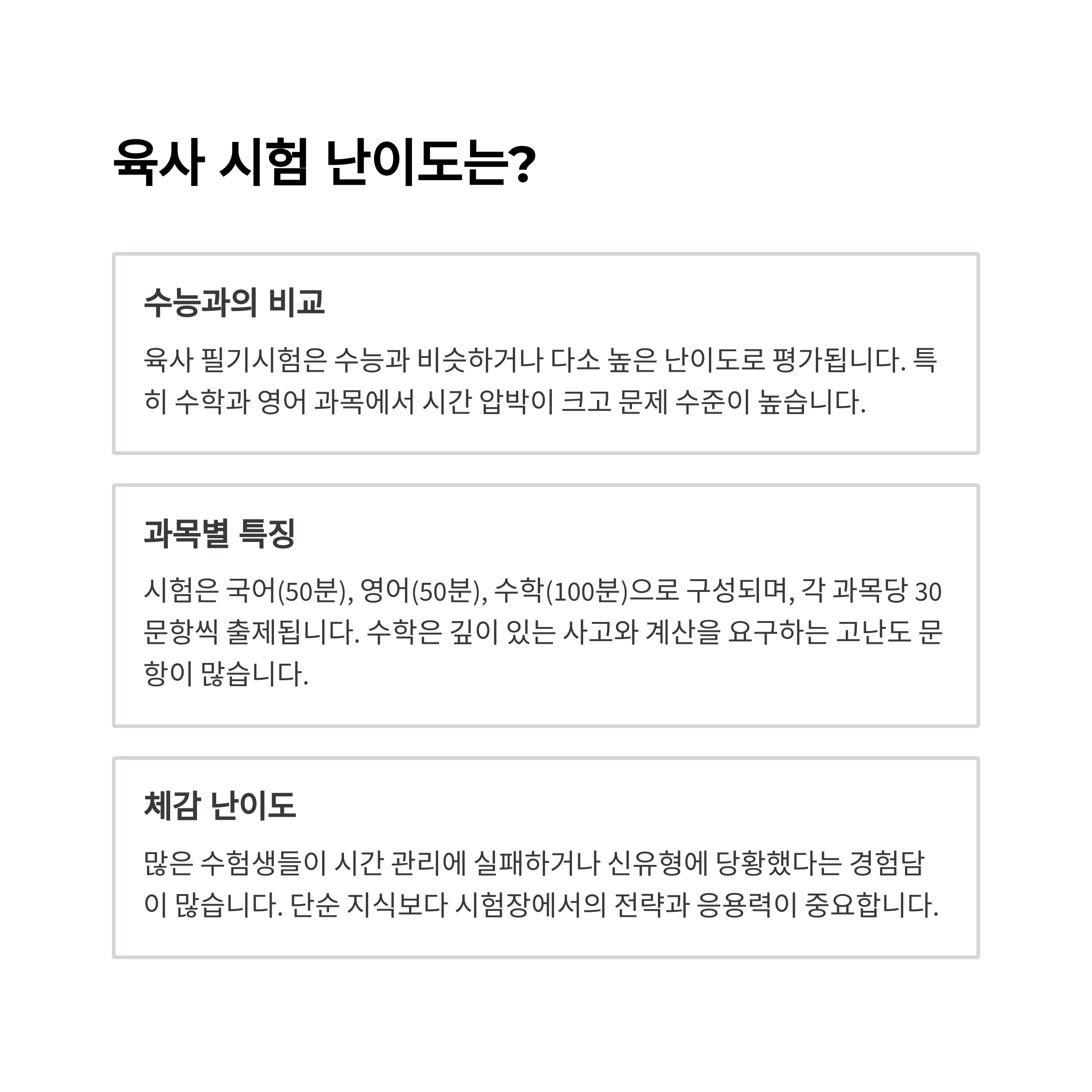 수능처럼 대입을 위한 국가 공통 시험은 아니지만, 육사의 시험은 지원자들의 분석력, 사고력, 문제 해결 능력을 다각도로 평가하려는 특징이 있기 때문에 유형이 다소 독특하고 변별력이 높습니다.