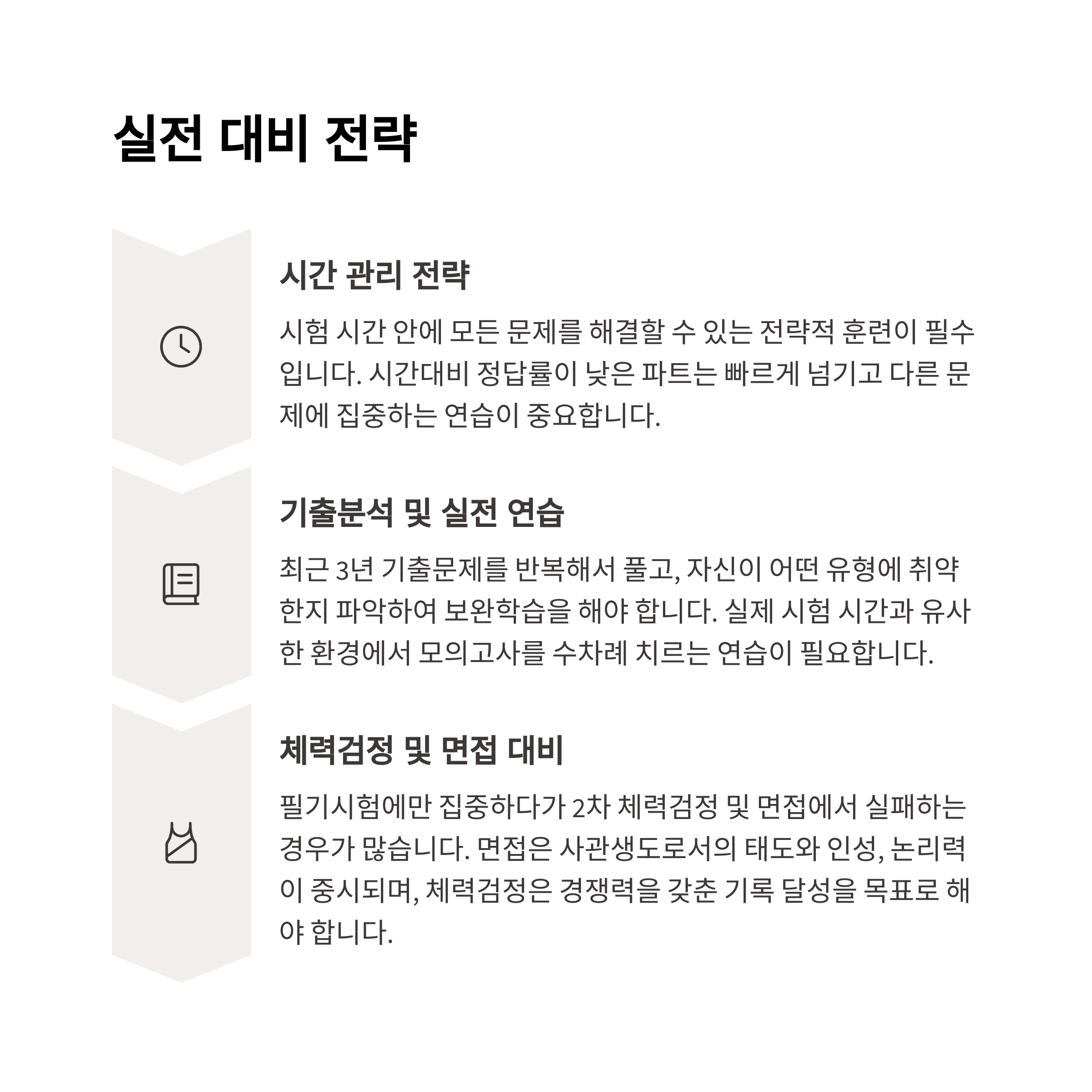최근 3년 기출문제를 반복해서 풀고, 자신이 어떤 유형에 취약한지를 파악하여 보완학습을 해야 합니다. 또한 실제 시험 시간과 유사한 환경에서 모의고사를 수차례 치르는 연습이 필요합니다.
