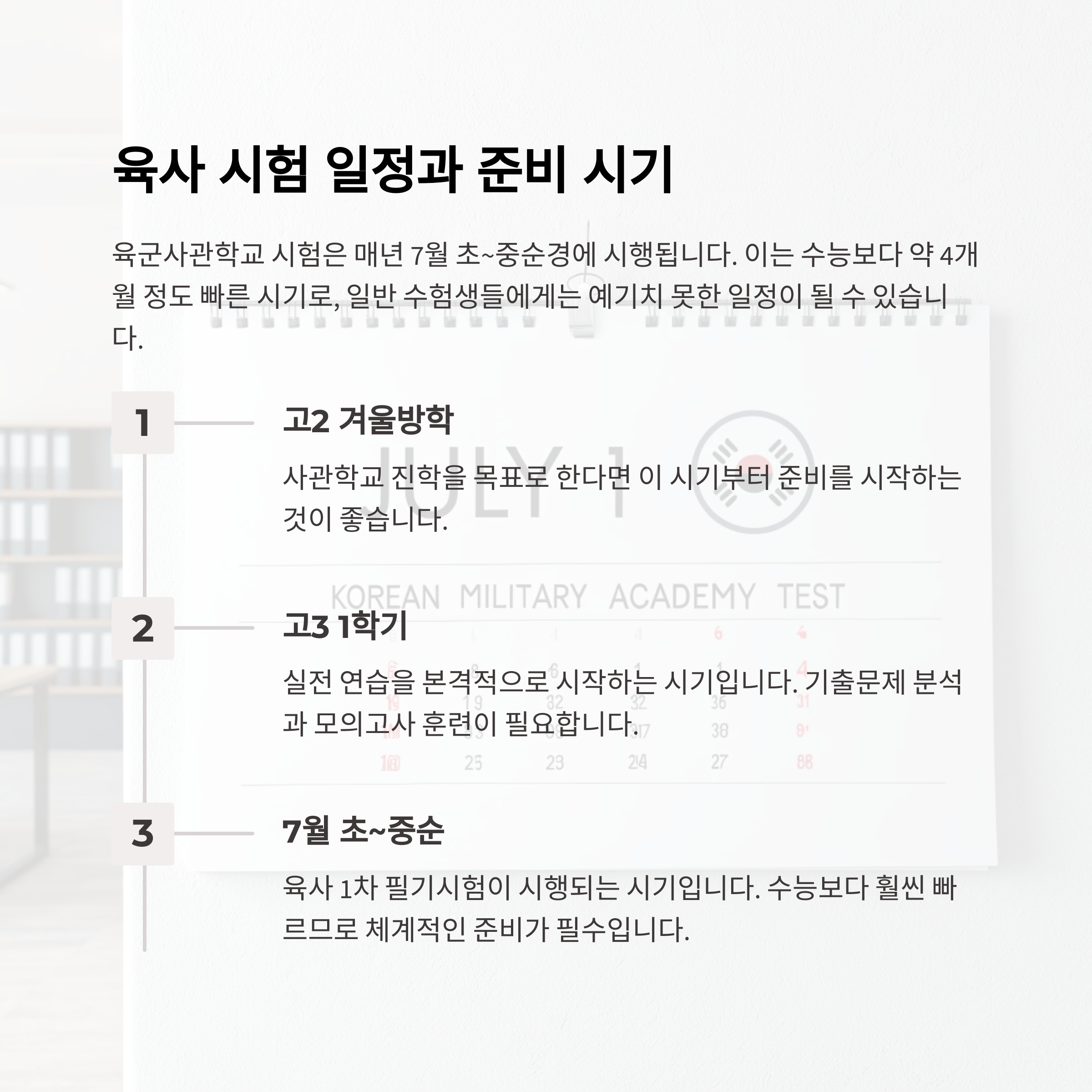 육군사관학교 시험은 매년 7월 초~중순경에 시행됩니다. 이는 일반 수험생들이 준비하는 수능보다 약 4개월 정도 빠른 시기입니다. 따라서 수능만을 준비하던 수험생에게는 예기치 못한 일정이 될 수 있으며, 사관학교 진학을 목표로 한다면 빠르고 체계적인 준비가 필수입니다.