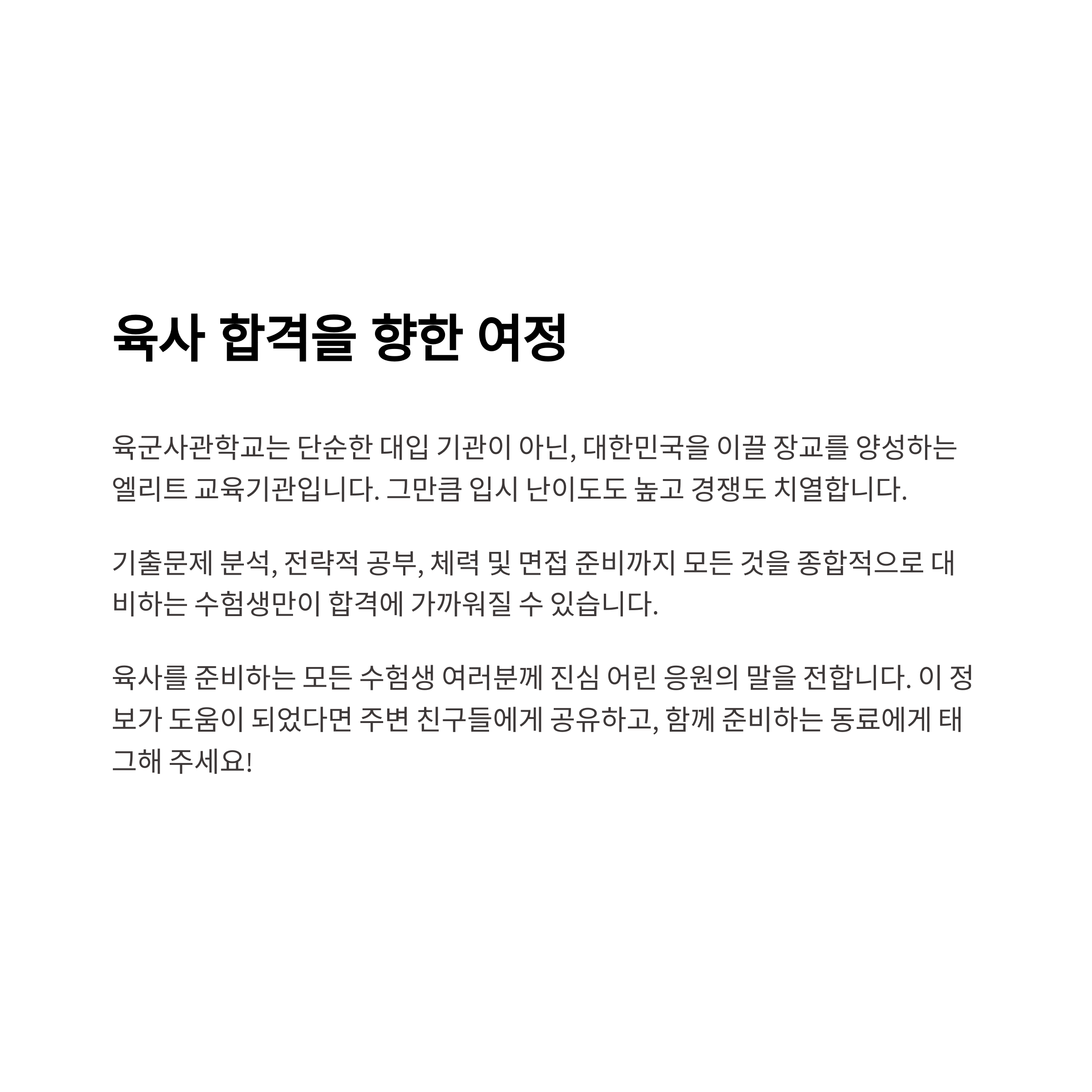 육사를 준비하는 모든 수험생 여러분께 진심 어린 응원의 말을 전하며, 이 글이 여러분의 합격 전략에 도움이 되길 바랍니다.