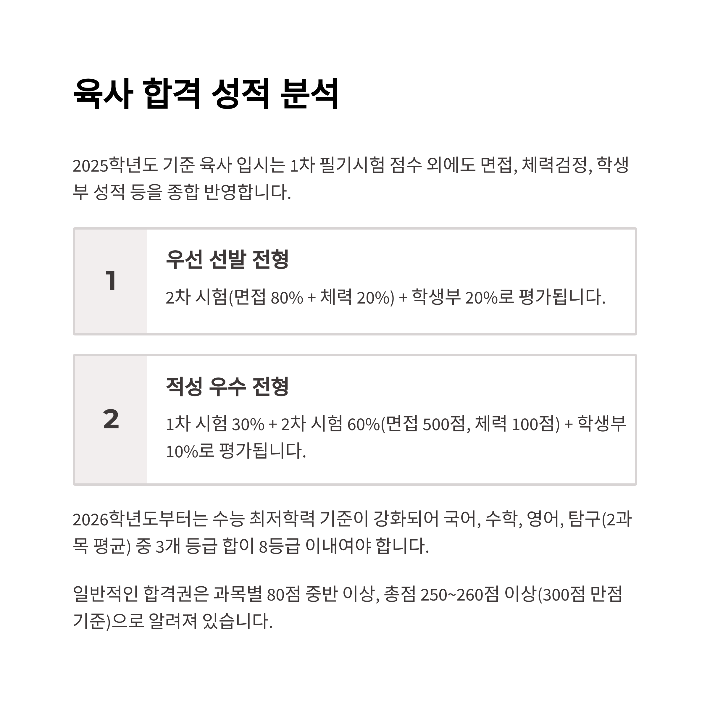 2025학년도 기준 육사 입시는 1차 필기시험 점수 외에도 면접, 체력검정, 학생부 성적 등을 종합 반영합니다.