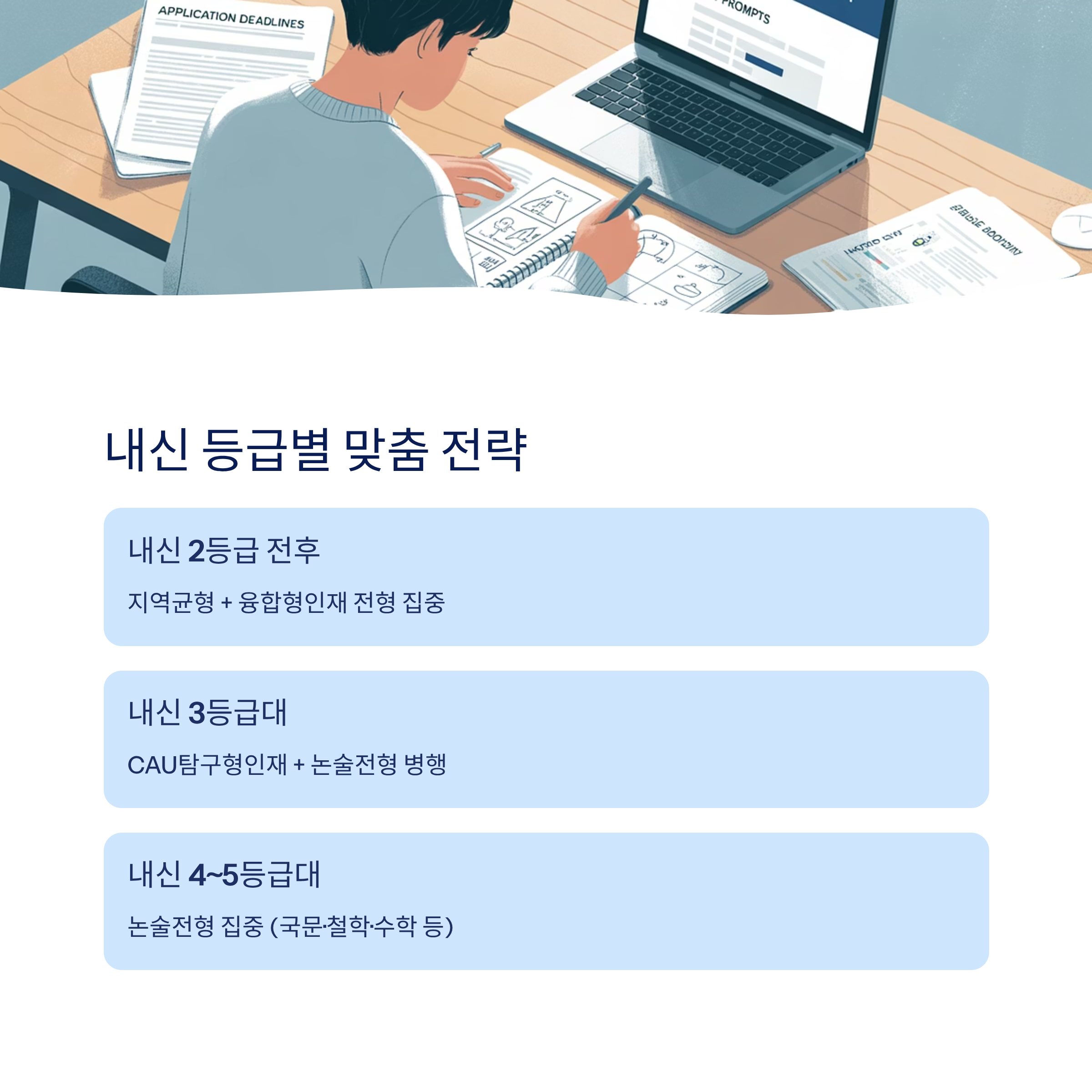 - 내신 중위권(3등급대): 종합·탐구형 병행, 논술로 역전 가능.