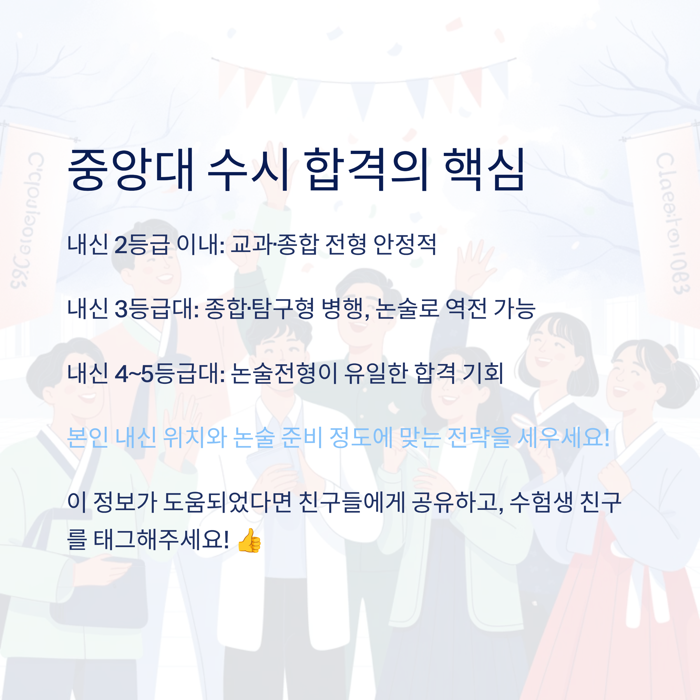 👉 따라서, 중앙대 수시를 준비하는 학생들은 본인 내신 위치 + 논술 준비 정도를 기준으로 전략을 세워야 하며, 특히 논술전형을 고려하는 학생은 지금부터 기출문제 분석과 실전 연습에 집중해야 합니다.