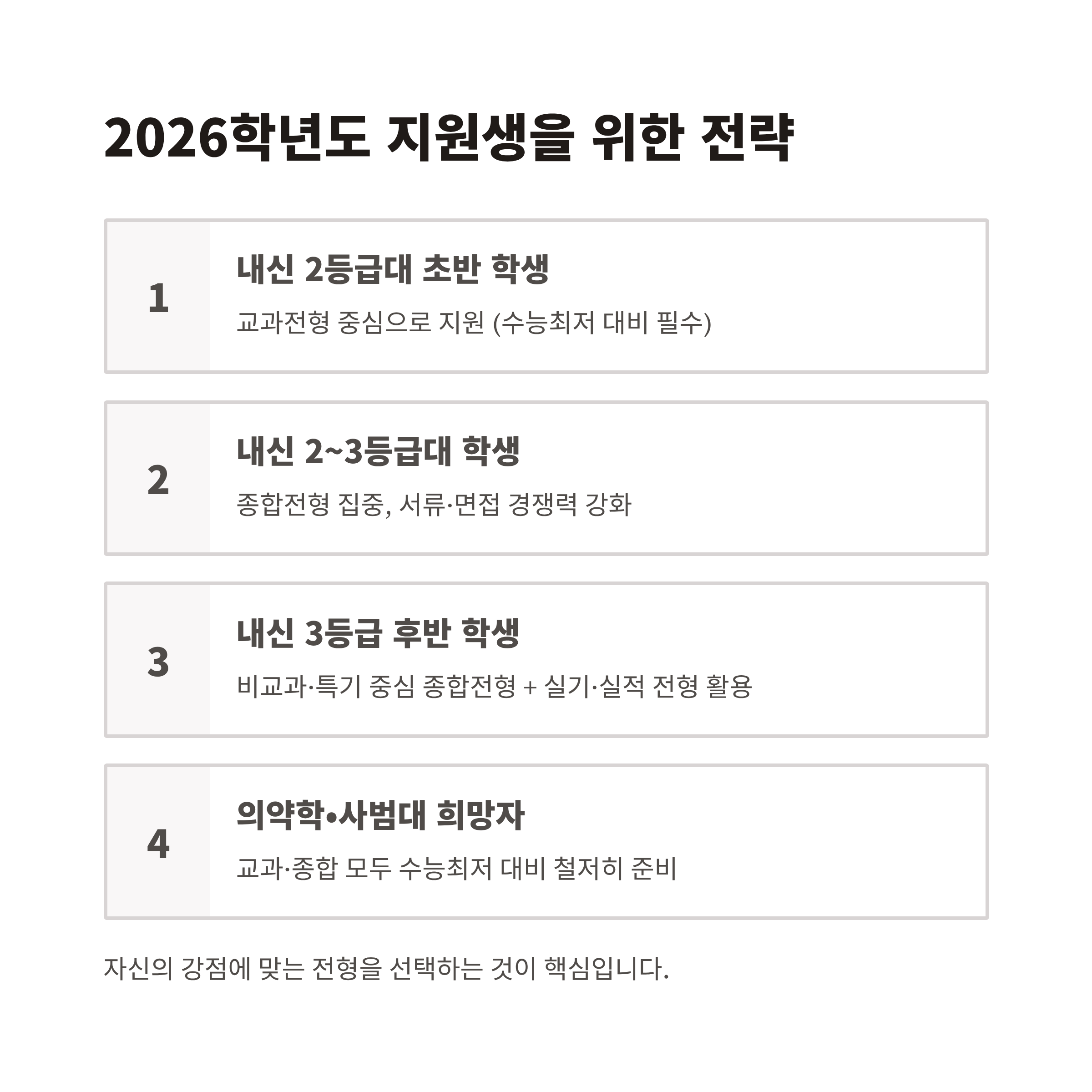 - 내신 3등급 후반 학생 → 비교과·특기 중심 종합전형 + 실기·실적 전형 활용