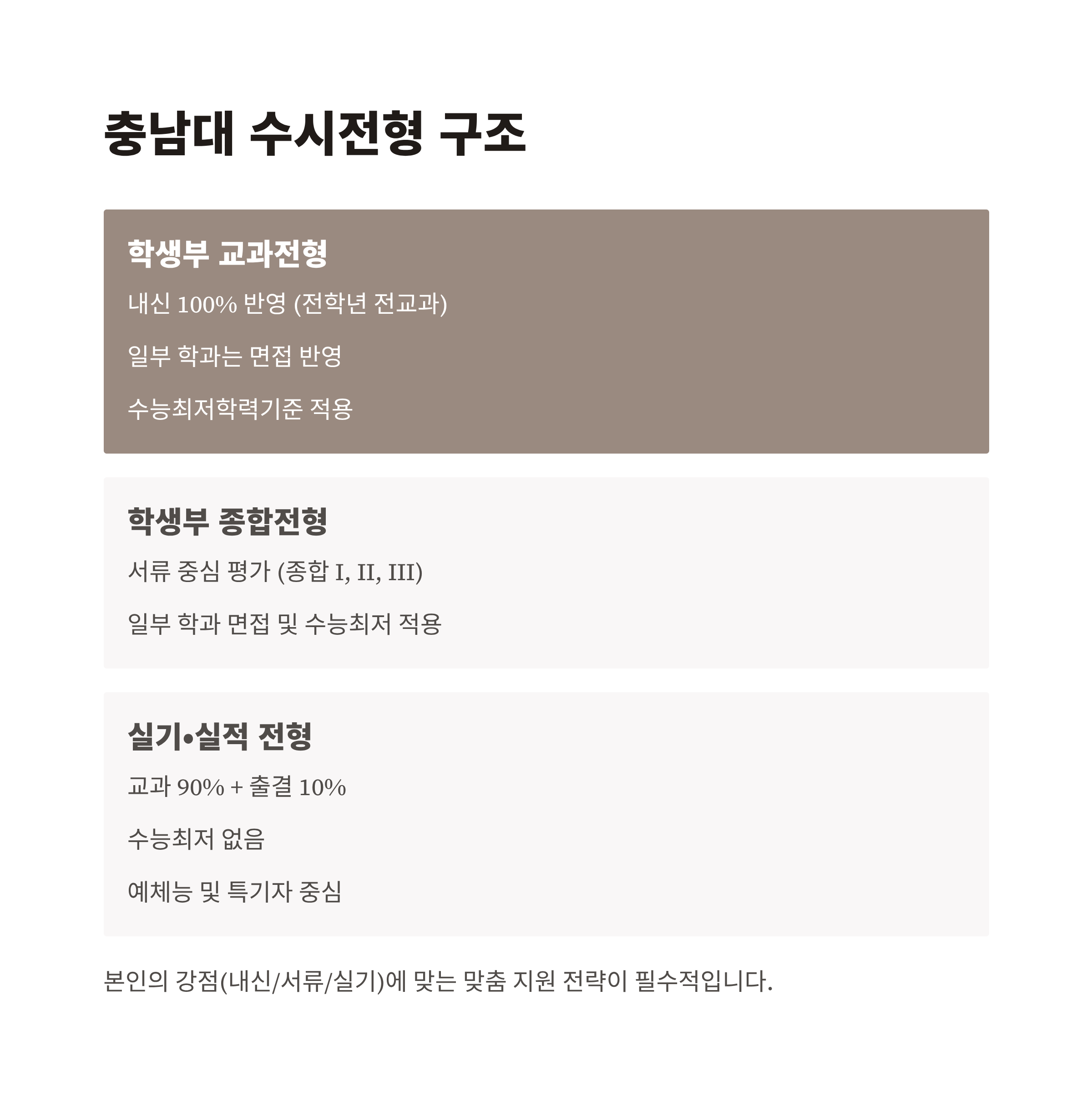👉 종합하면, 충남대 수시는 교과는 안정권 학생, 종합은 서류 경쟁력 있는 학생, 실기는 특기자 학생에게 각각 최적화된 구조입니다.