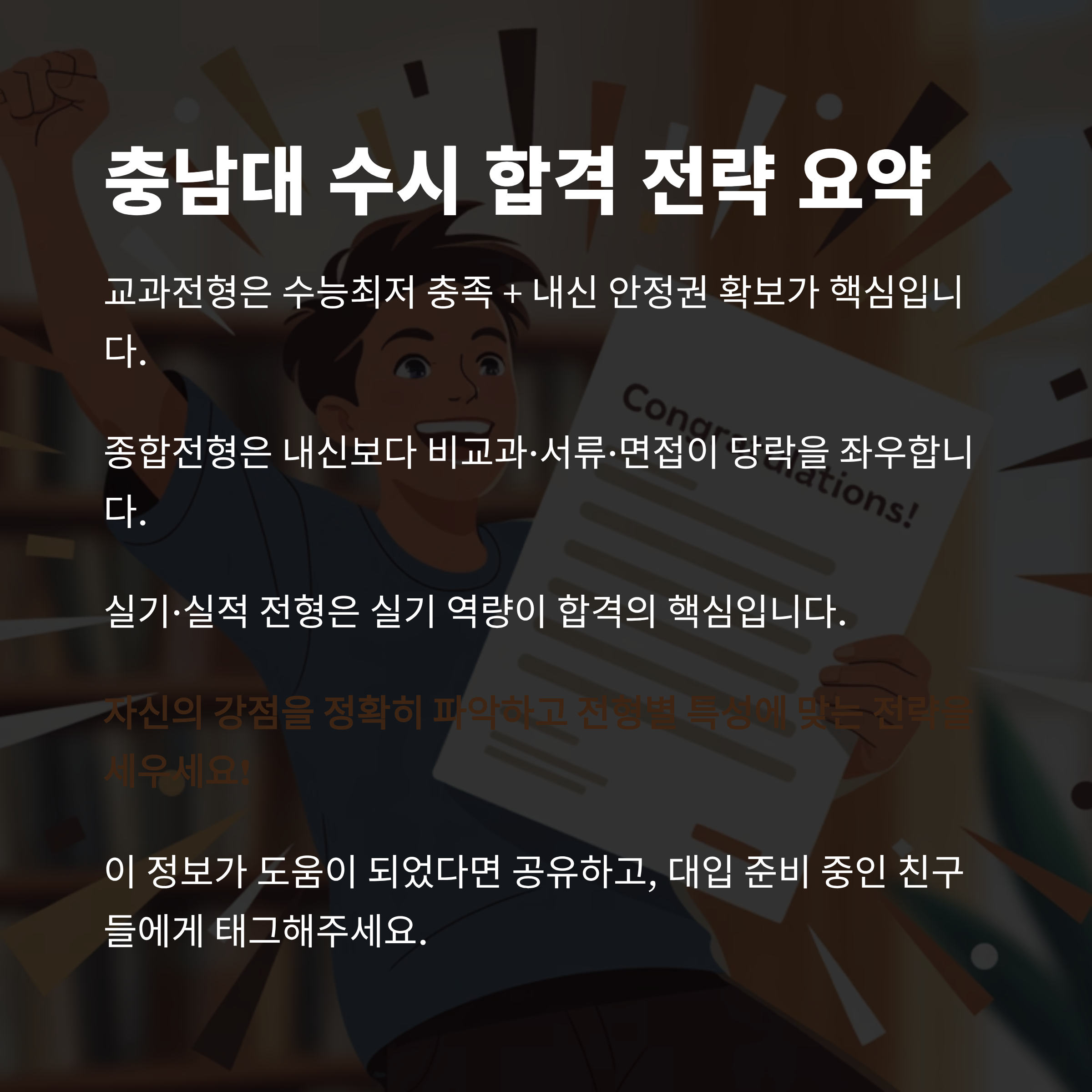 👉 충남대 수시는 전형마다 특성이 뚜렷해, 본인의 강점(내신/서류/실기)에 맞는 맞춤 지원 전략이 필수적입니다.