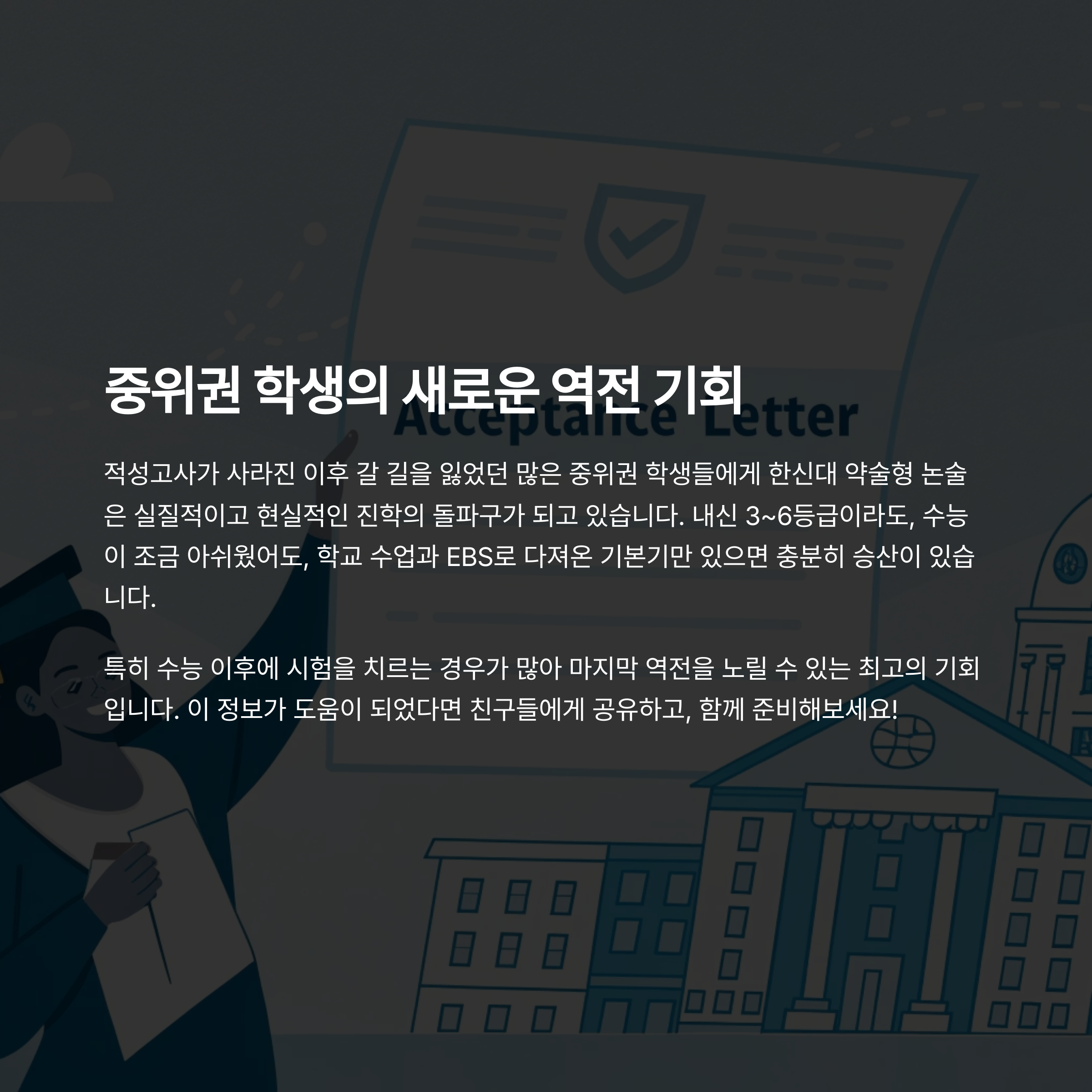 적성고사가 사라진 이후 갈 길을 잃었던 많은 중위권 학생들에게 한신대 약술형 논술은 실질적이고 현실적인 진학의 돌파구가 되고 있습니다.