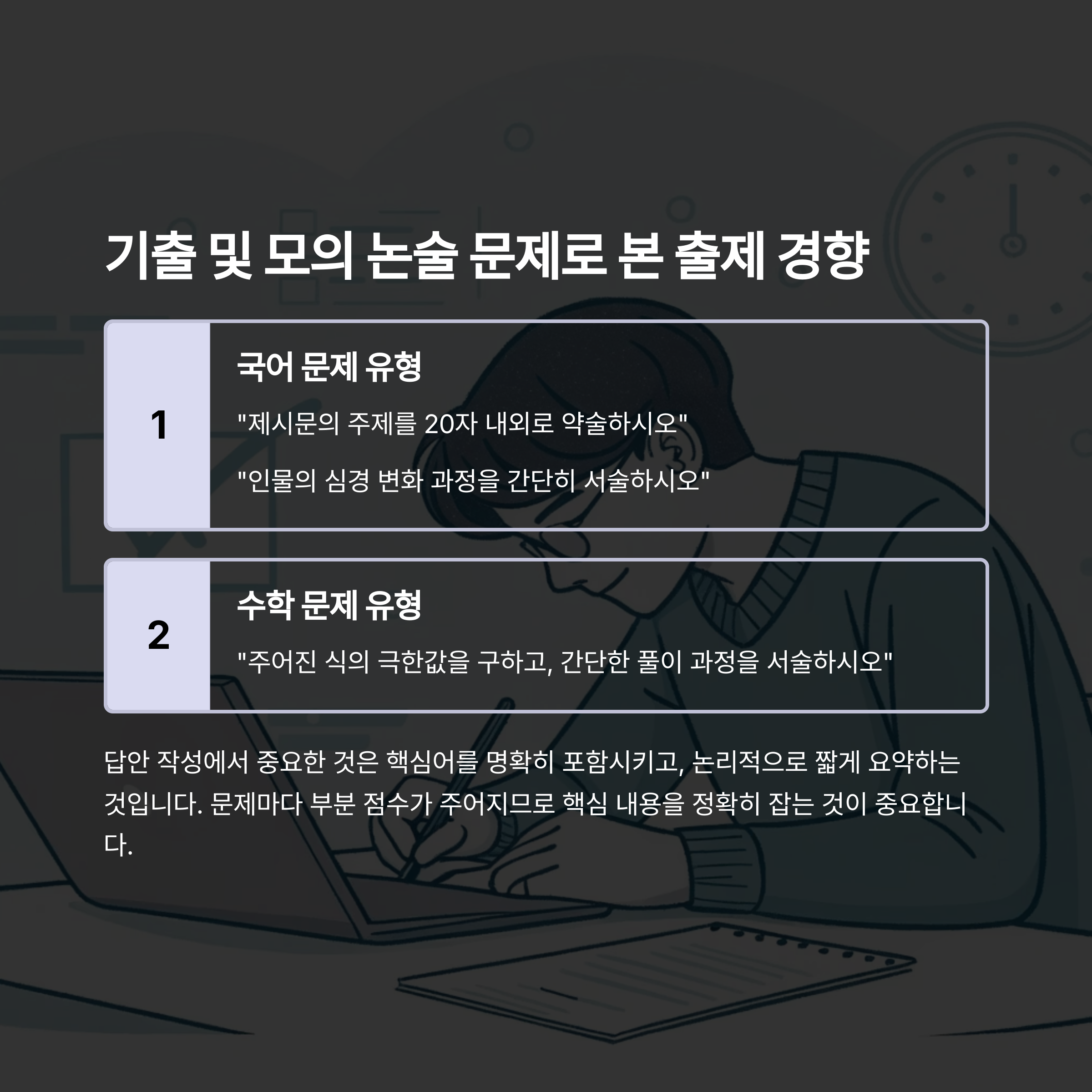 - 국어에서는 “제시문의 주제를 20자 내외로 약술하시오”, “인물의 심경 변화 과정을 간단히 서술하시오” 같은 형태가