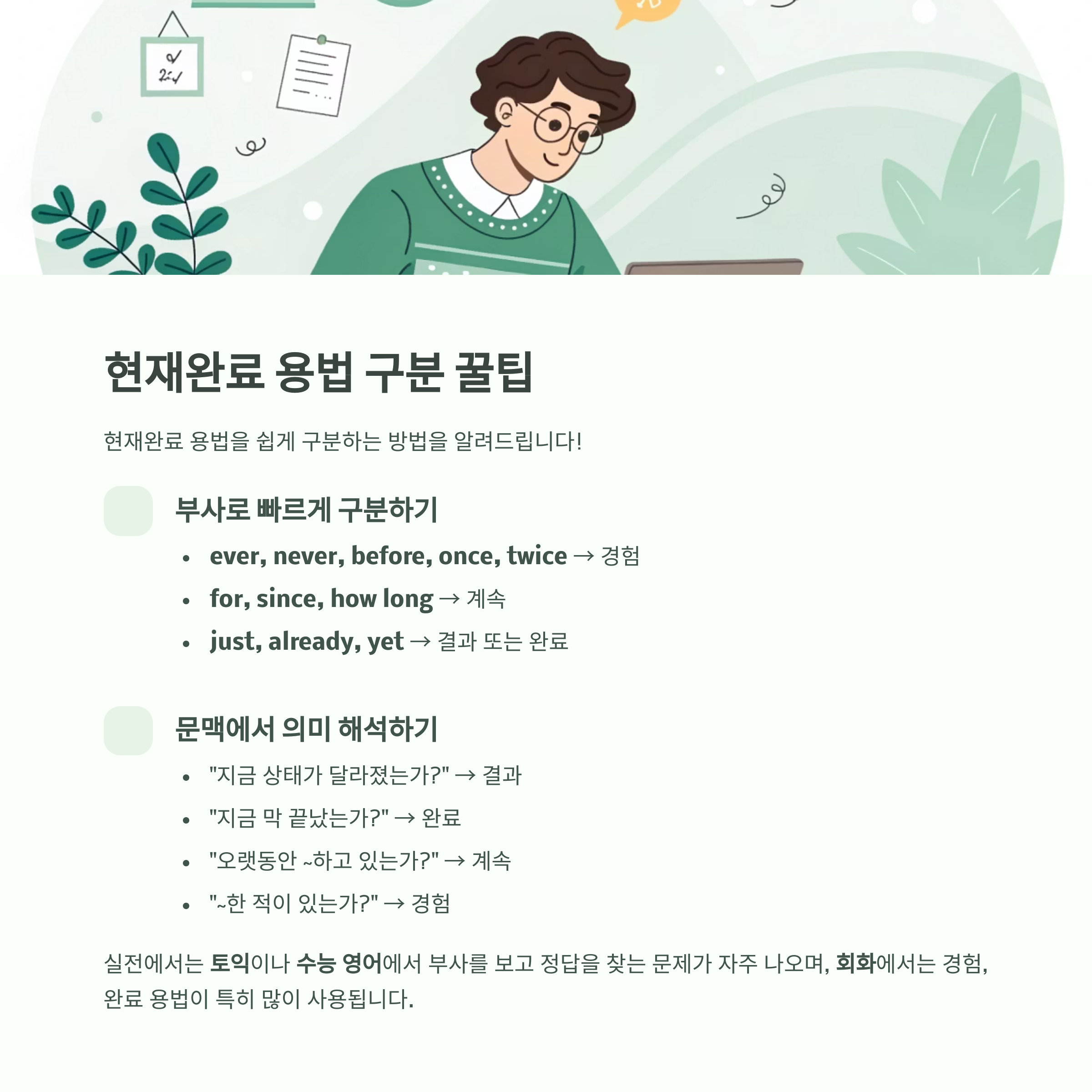 현재완료는 단순히 공식을 외우는 것보다 용법별로 구분해 반복 연습하는 것이 중요합니다.