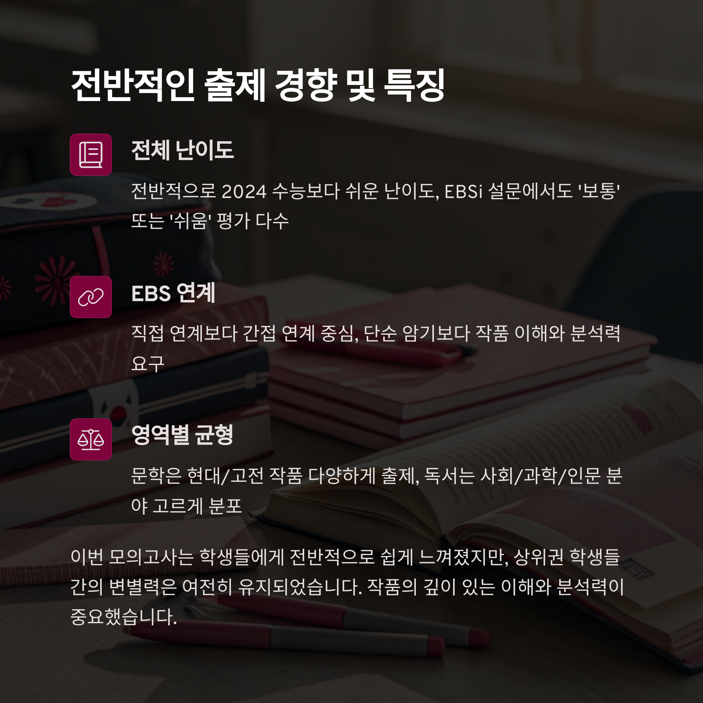 이번 시험의 난이도는 전반적으로 2024 수능보다 쉬웠다는 평가가 지배적입니다. EBSi 설문조사 결과에서도 ‘보통’ 또는 ‘쉬웠다’는 반응이 다수를 차지했습니다. 그러나 일부 영역, 특히 언어와 매체 영역의 문장 짜임, 높임 표현 문제 등은 복잡한 문법 지식을 종합적으로 요구해 상당한 난이도를 보였습니다. 따라서 상위권 학생 간의 변별력은 여전히 유지되었습니다.