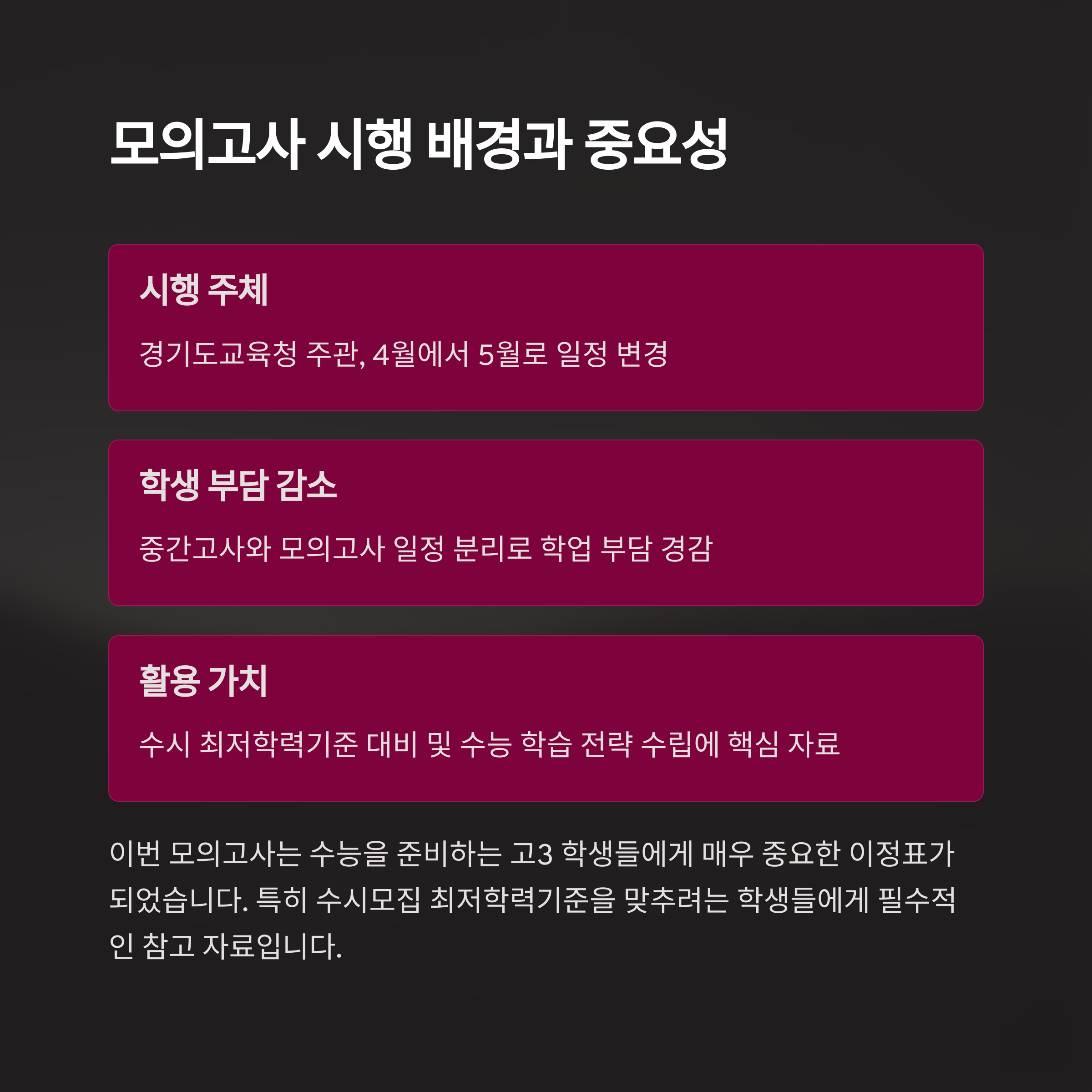 이번 모의고사는 경기도교육청이 주관했으며, 작년부터 시험 일정이 기존 4월에서 5월로 변경된 점이 눈에 띕니다. 이는 중간고사와 모의고사가 겹치며 발생하는 고3 학생들의 부담을 줄이기 위한 조치로 평가됩니다. 무엇보다 이 시험은 수시모집에서 최저학력기준을 맞추려는 학생들에게 매우 중요한 참고 자료가 됩니다. 또한, 2025학년도 대학수학능력시험 대비 학습 전략을 수립하는 데 결정적인 역할을 합니다.