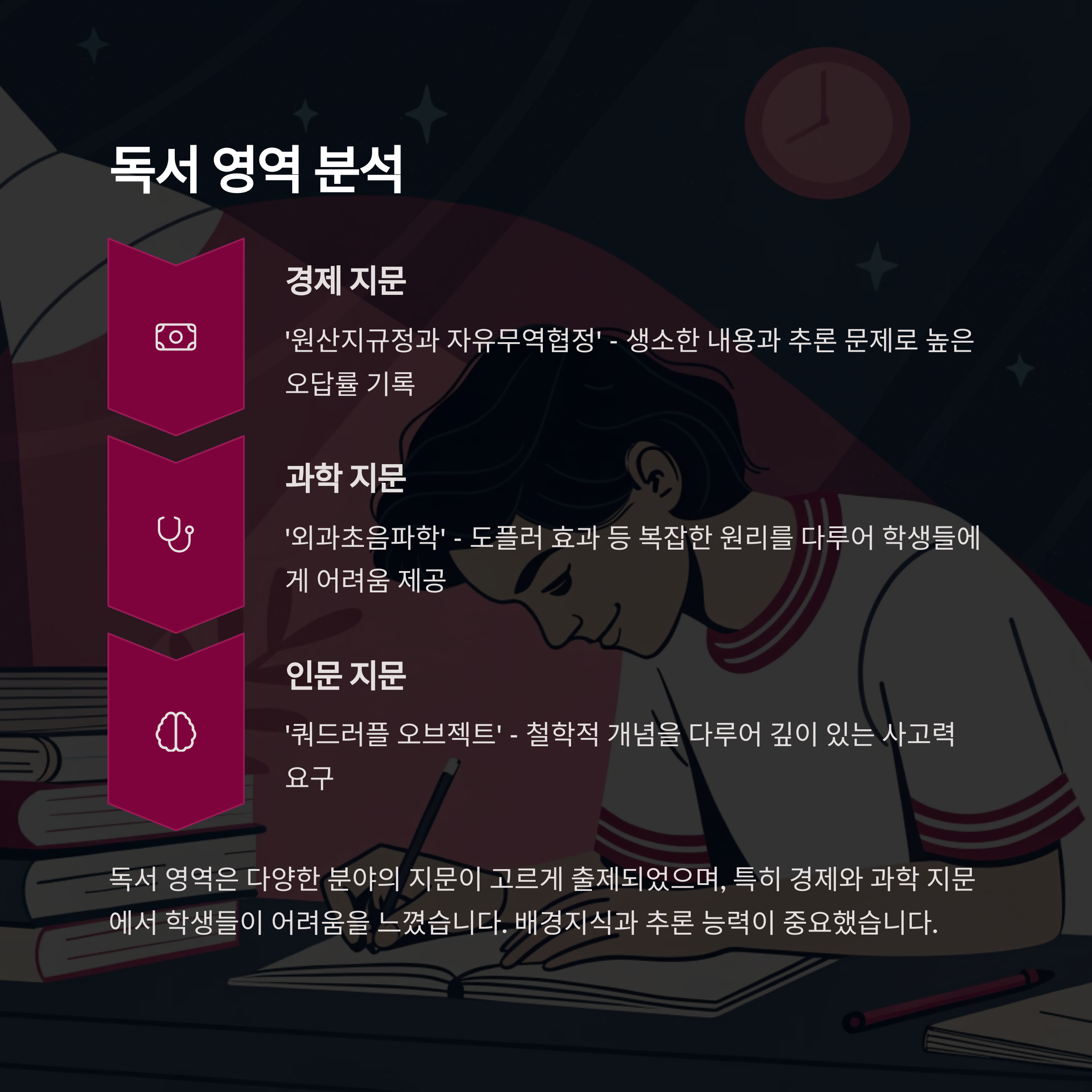 독서 영역에서는 경제 지문인 ‘원산지규정과 자유무역협정’, 과학 지문인 ‘외과초음파학’, 인문 지문인 ‘쿼드러플 오브젝트’ 등이 출제되었습니다. 특히 경제 지문은 다소 생소한 내용과 추론 문제로 높은 오답률을 기록했으며, 과학 지문도 도플러 효과 등 복잡한 원리를 다뤄 학생들에게 어려움을 주었습니다.